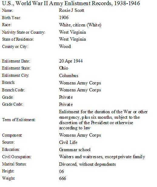 NOTE: WWII U.S. Army Enlistment Record lists her as divorced with no dependents.