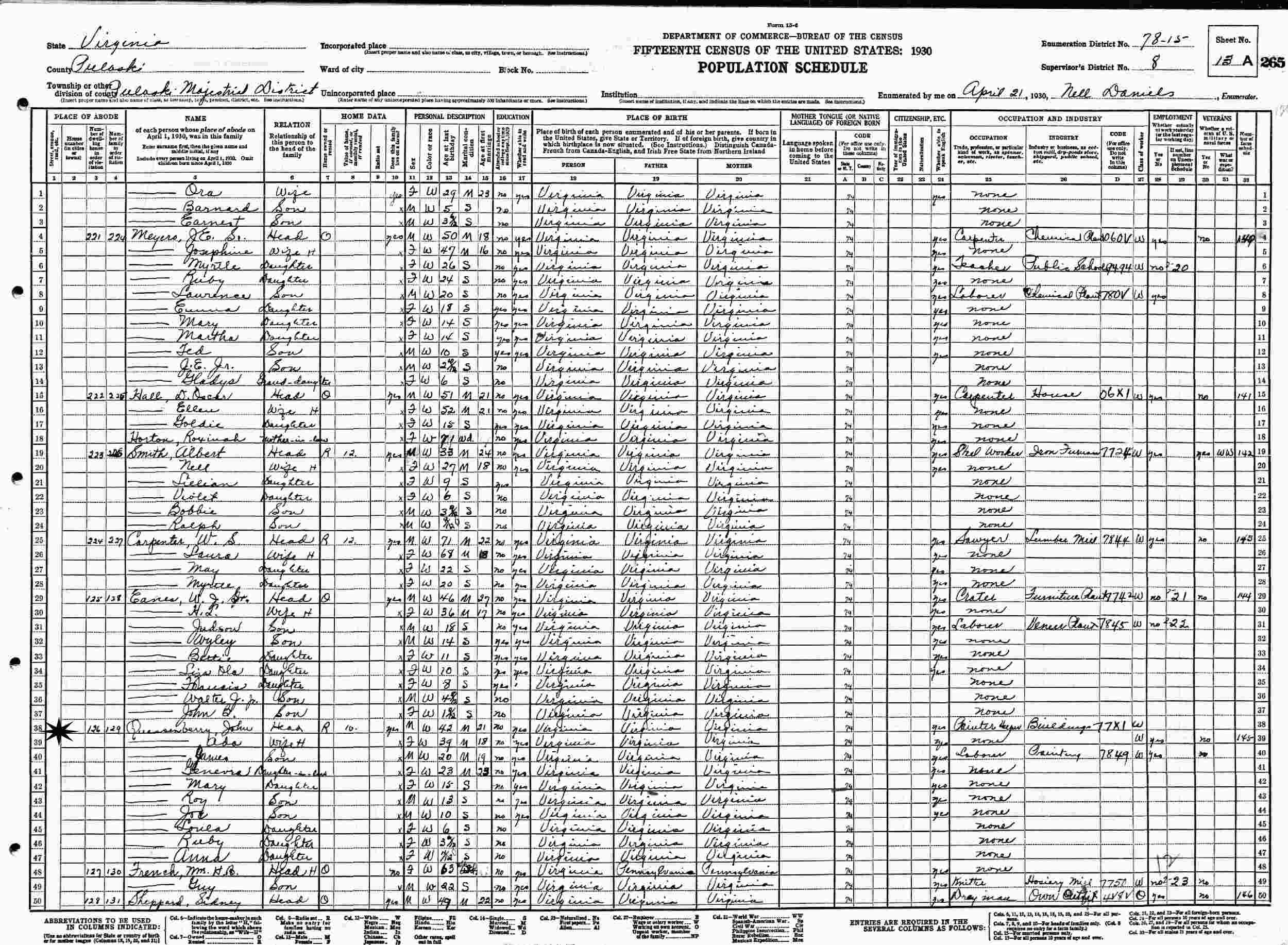 April 21, 1930 - Supervisor's District 8, Enumeration District 78-15,Pulaski Magisterial District, Pulaski County, Virginia.
