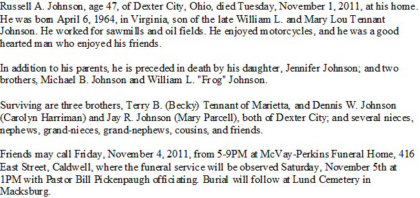 Died: November 1, 2011 in Dexter City, Noble County, Ohio.