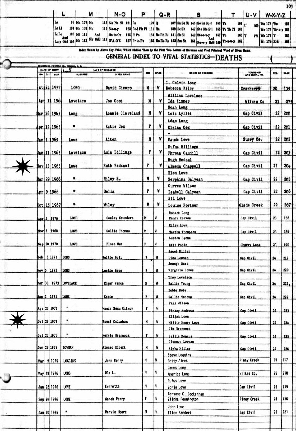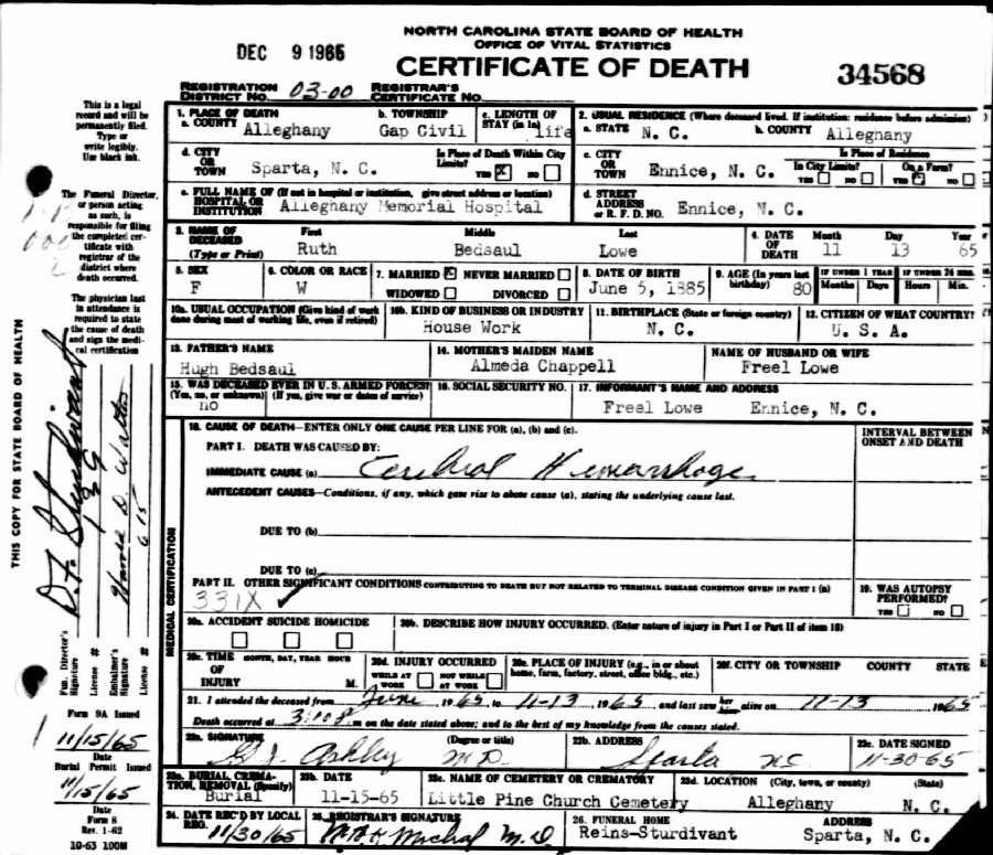 Married: Freel Columbus Lowe November 25, 1900 in Alleghany County, North Carolina.