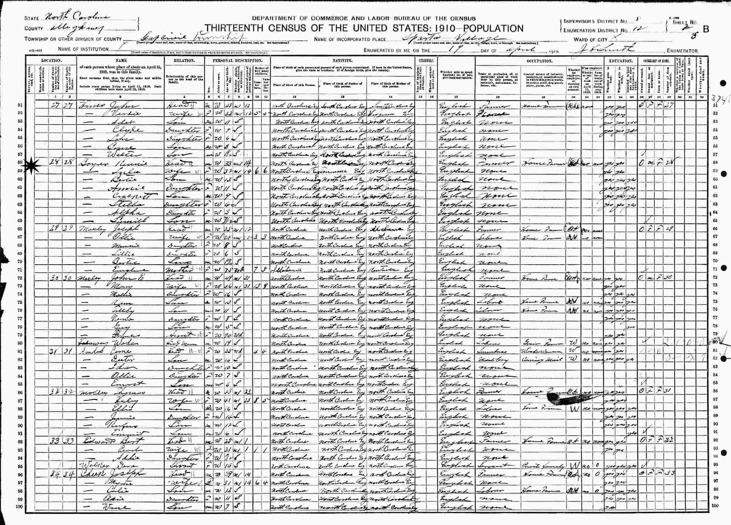 April 19, 1910 - Sparton Village, Supervisor's District 8, Enumeration District 12, Gap Civil Township, Alleghany County, Virginia.