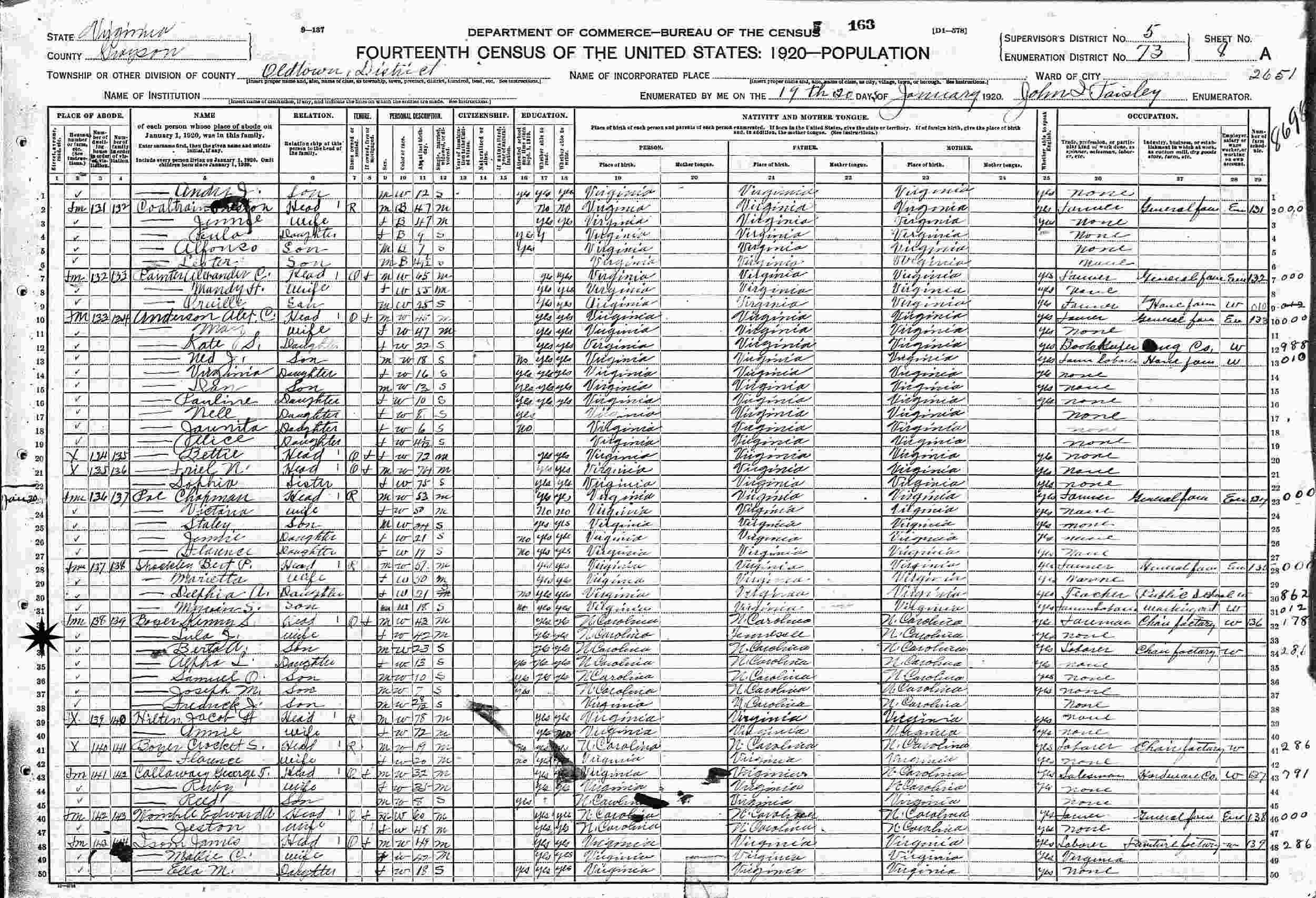 January 20, 1920 - Oldtown District, Supervisor's District 5, Enumeration District 73, Grayson County, Virginia.