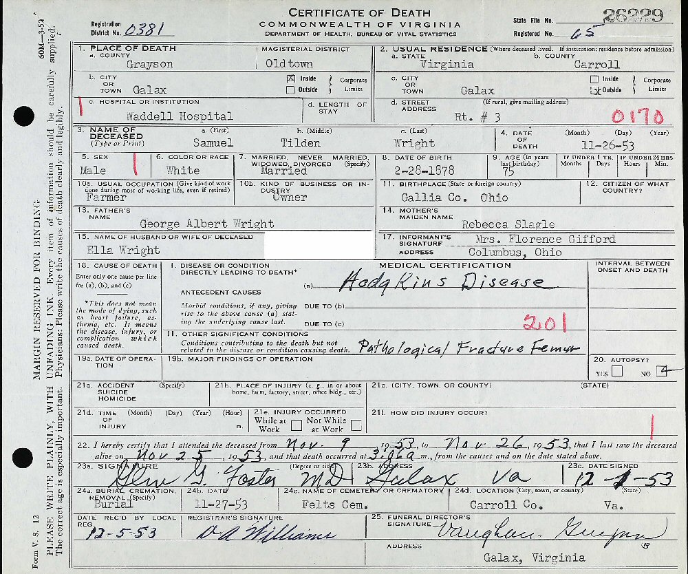 Died: November 26, 1953 in Galax, Grayson County, Virginia.
