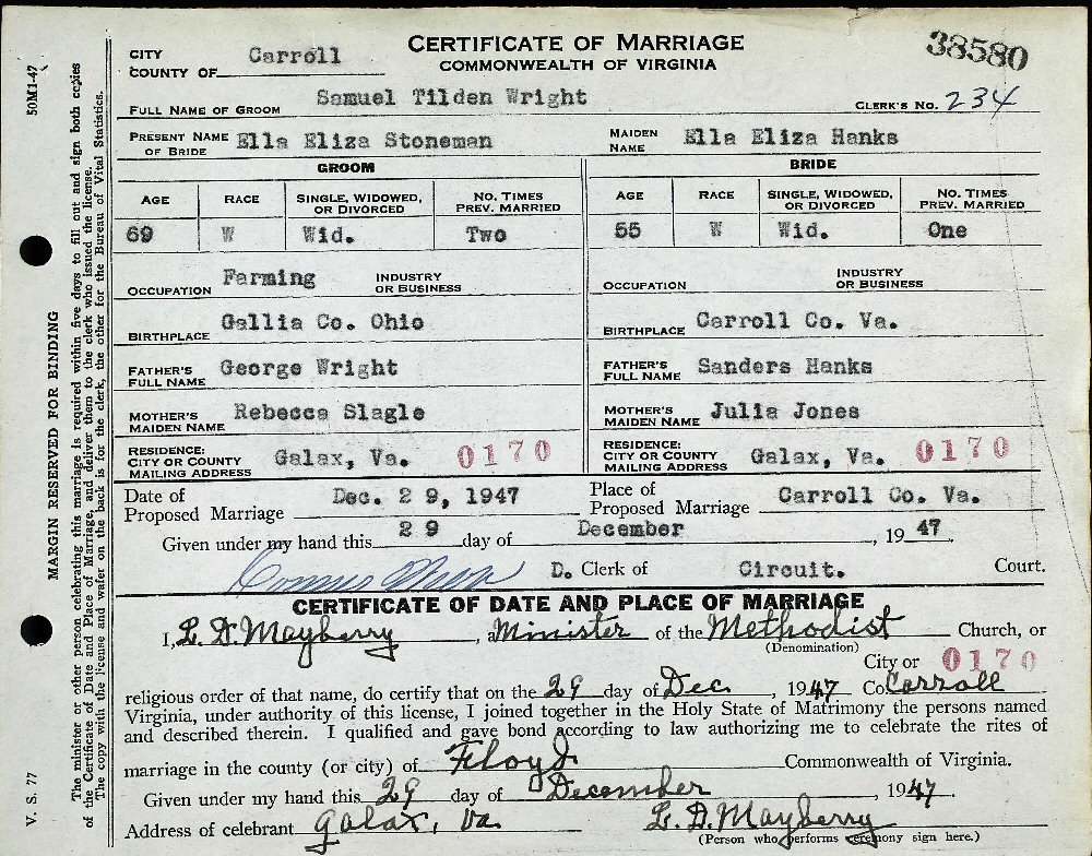 Married: Eliza Ella (nee Hanks) Stoneman December 29, 1947 in Carroll County, Virginia.