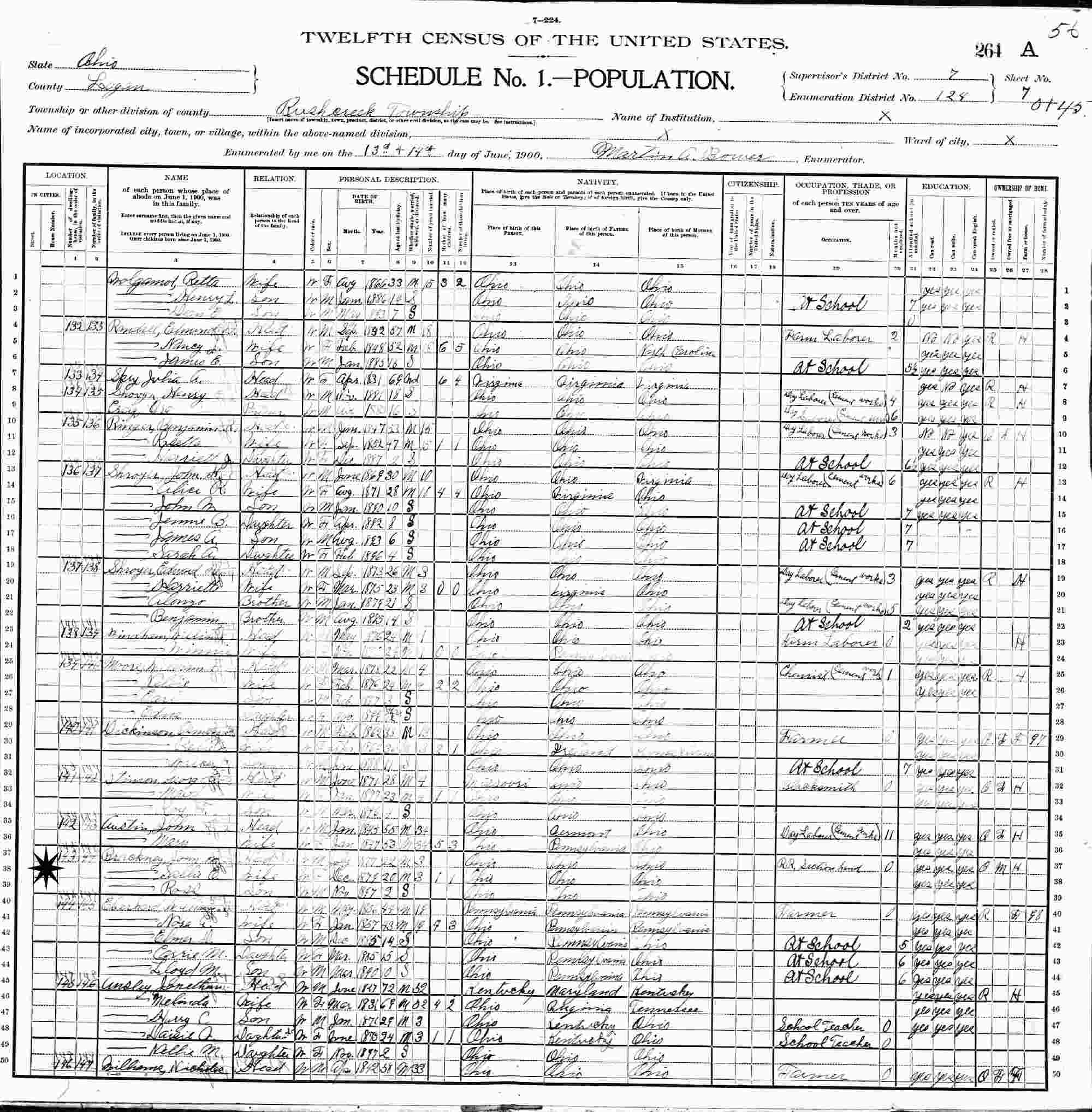 June 13-14, 1900 - Supervisor's District 7, Enumeration District 124, Rush Creek, Logan County, Ohio.