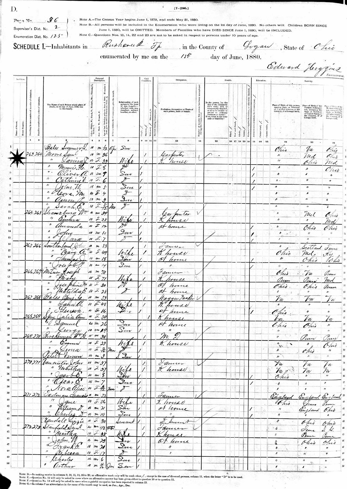 June 15, 1880 - Supervisor's District 2, Enumeration District 125, Rush Creek Township, Logan County, Ohio.