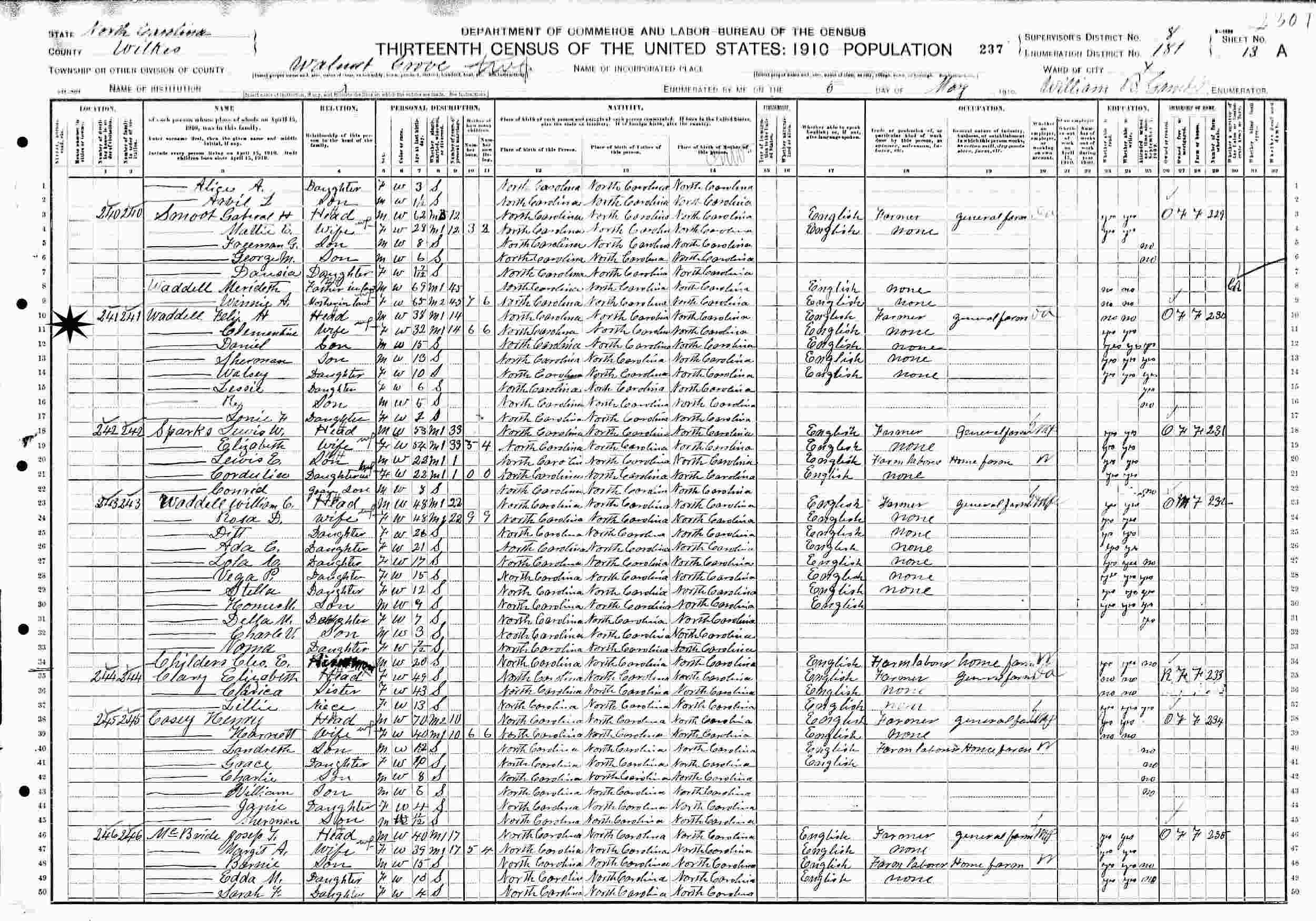 May 5, 1910 - Supervisor's District 8, Enumeration District 181, Walnut Grove, Wilkes County, North Carolina.