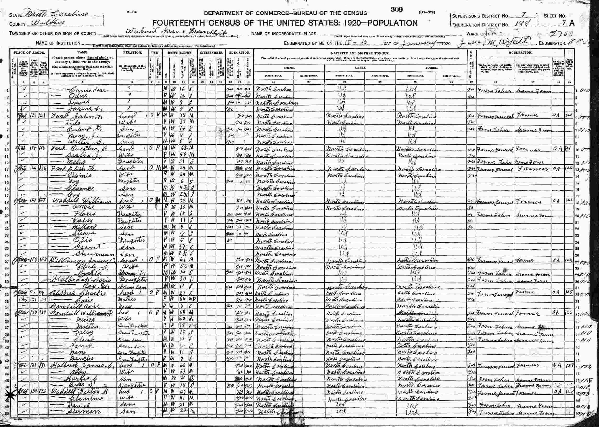 January 15-16, 1920 - Supervisor's District 7, Enumeration District 188, Walnut Grove, Wilkes County, North Carolina.