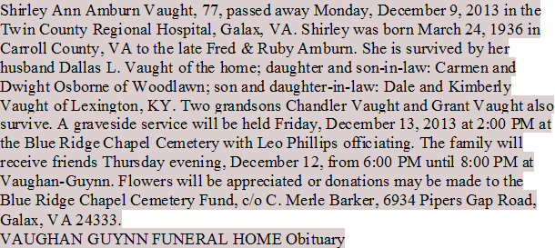 Notes for SHIRLEY ANN AMBURN VAUGHT: