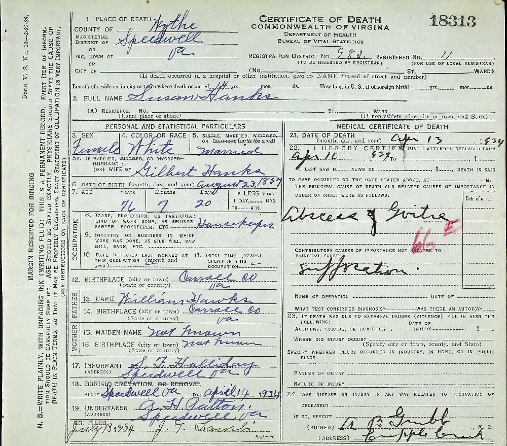 Died: April 12, 1934 in pSpeedwell, Wythe County, Virginia.