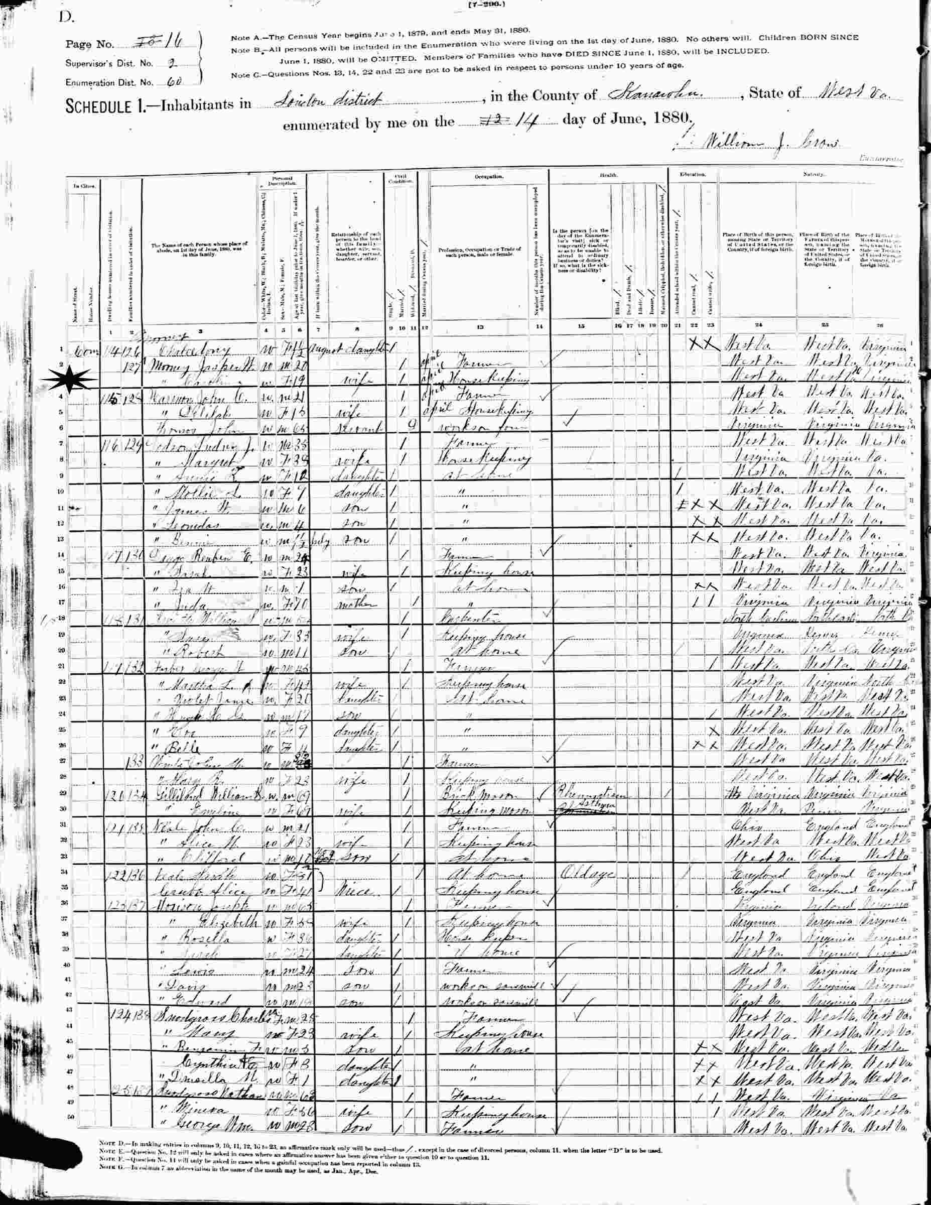 June 14, 1880 - Supervisor's District 2, Enumeration District 60, Loudon District, Kanawha County, West Virginia.