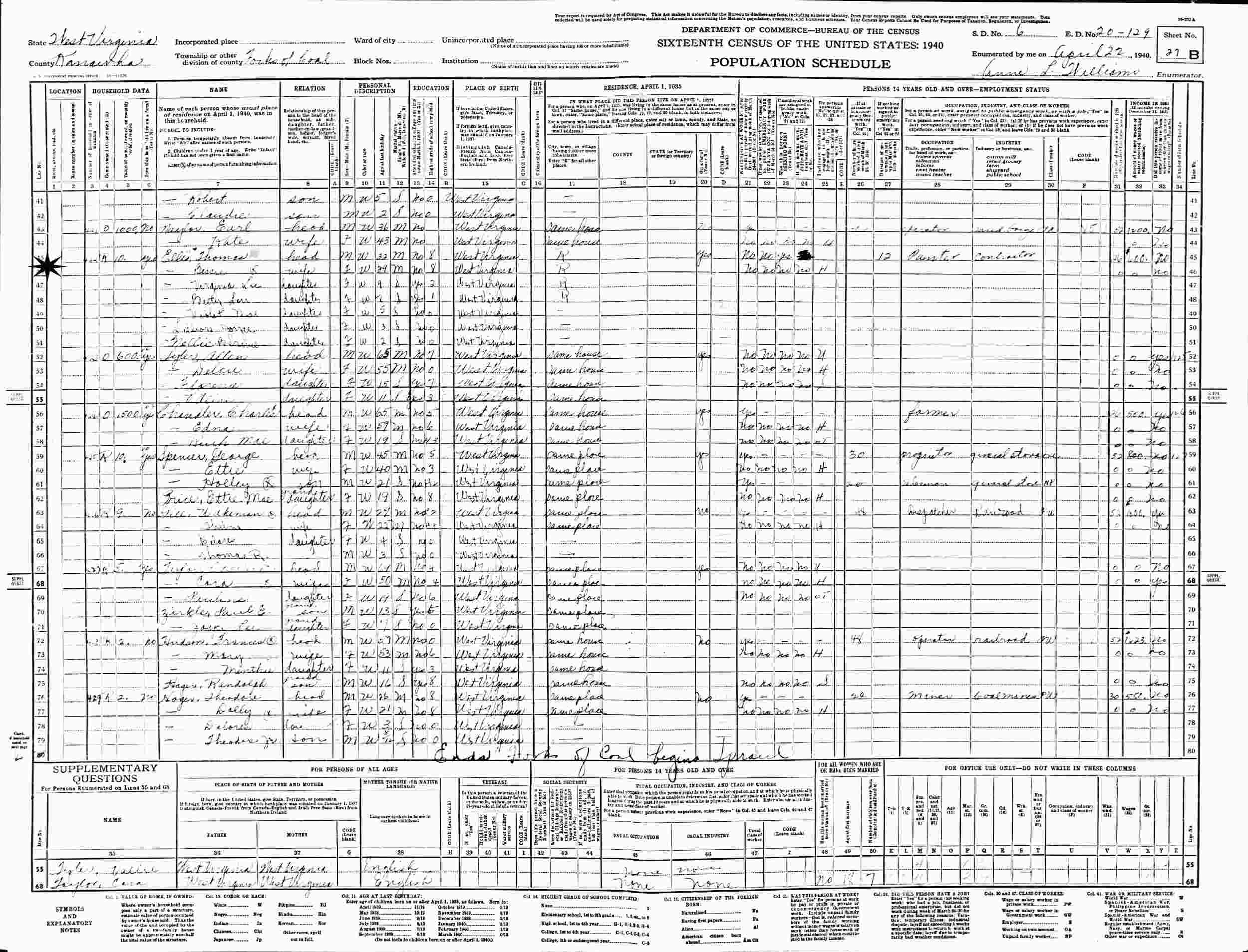 April 22, 1940 - Supervisor's District 6, Enumeration District 20-129, Forks of Coal, Kanawha County, West Virginia.