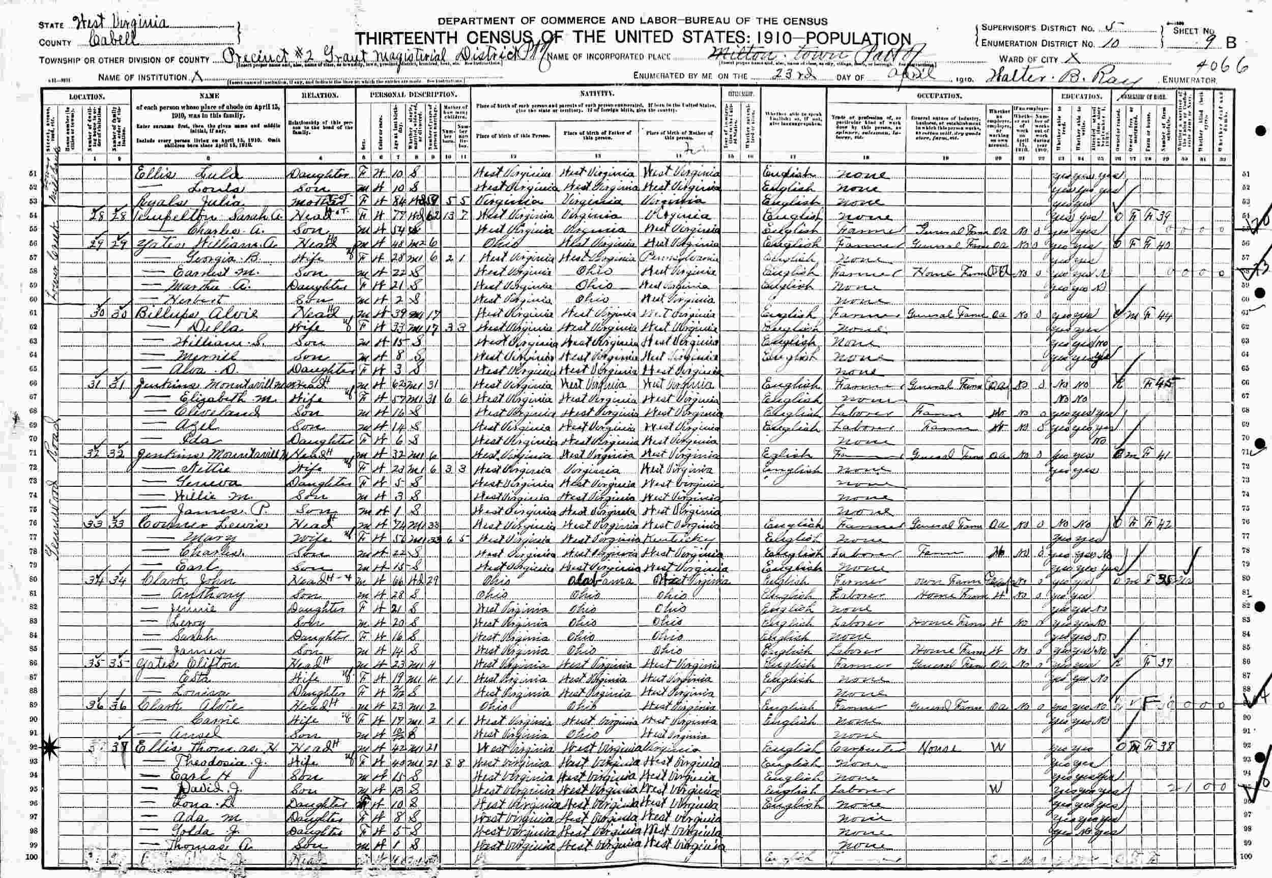 April 23, 1910 - Precinct 2, Supervisor's District 5, Enumeration District 10, Grant Magisterial District, Cabell County, West Virginia.