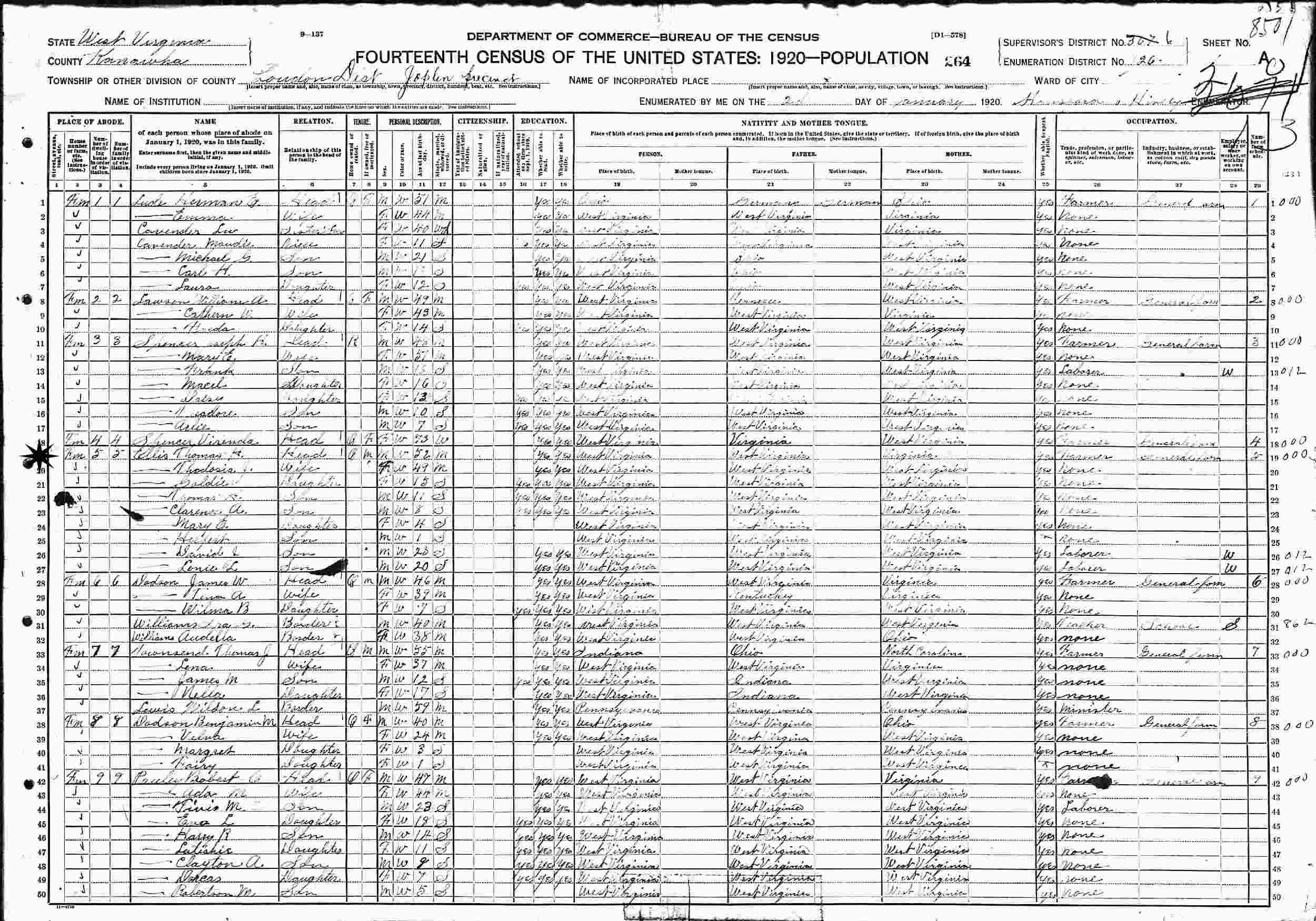 January 2, 1920 - Supervisor's District 267 (crossed out to 6), Enumeration District 26, Loudon District, Joplin Precinct, Kanawha County, West Virginia.
