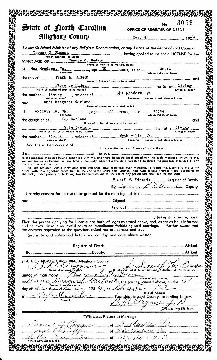 Married: Margaret "Margie" Anna Garland December 31, 1954 in Alleghany County, North Carolina.