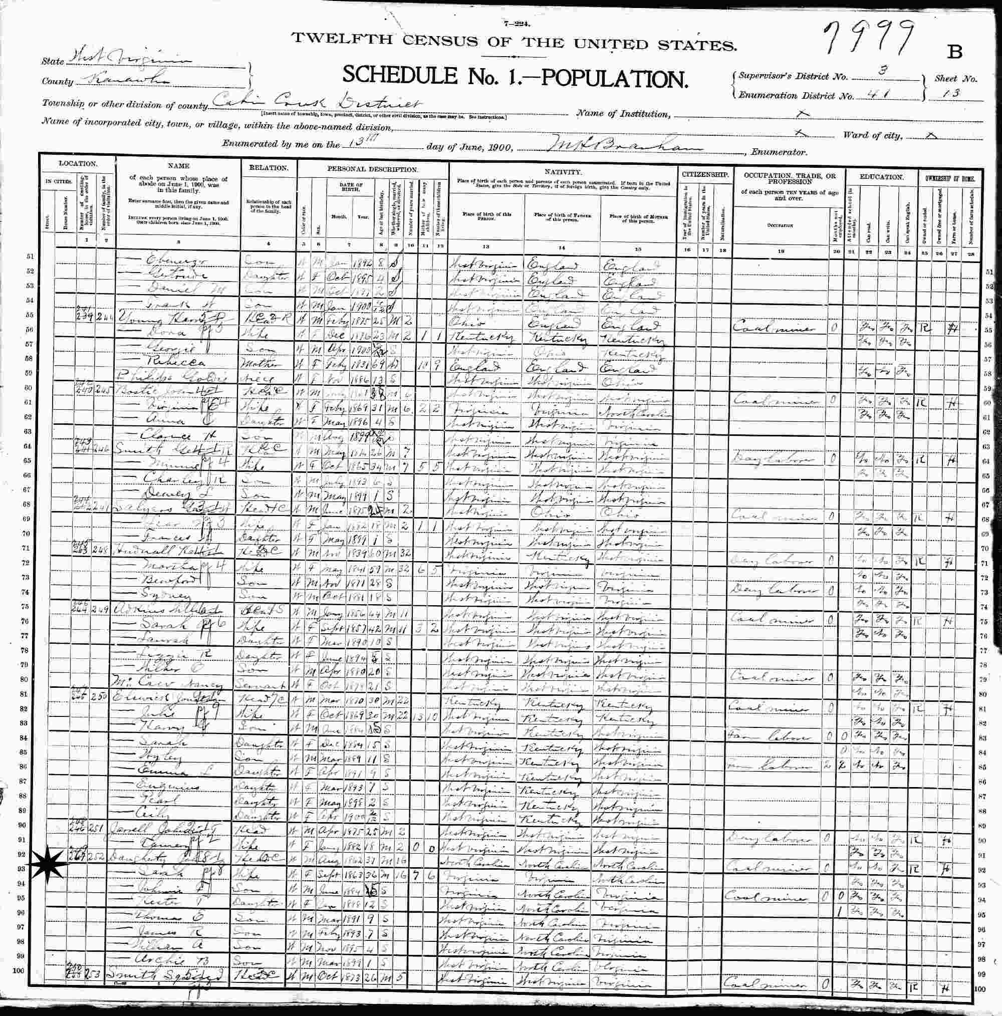 June 13, 1900 - Supervisor's District 3, Enumeration District 41, Cabin Creek District, Kanawha County, West Virginia.