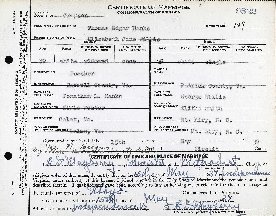 (2) Elizabeth Jane Willis May 15, 1937 in Independence, Grayson County, Virginia.