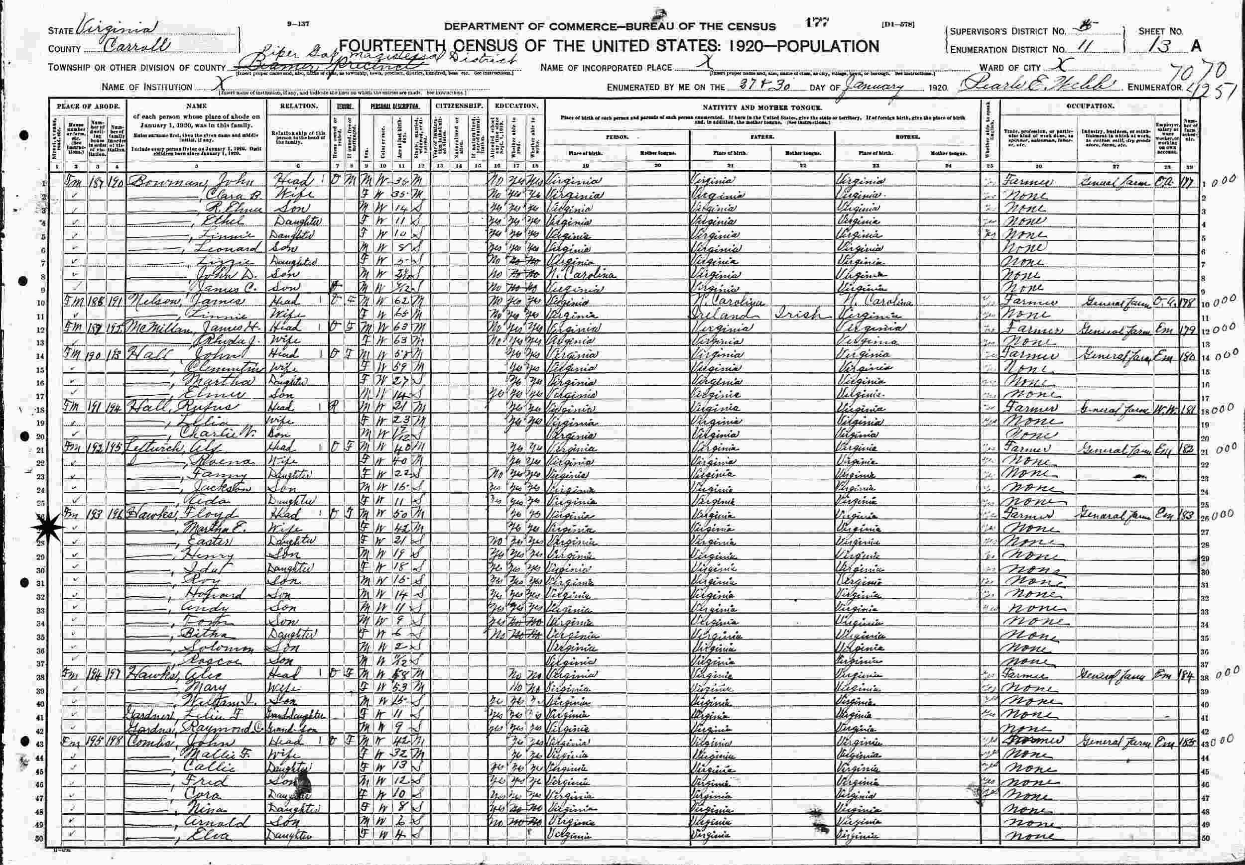 January 27-30, 1920 - Supervisor's District 5, Enumeration District 11, Pipers Gap Magisterial District, Carroll County, Virginia.