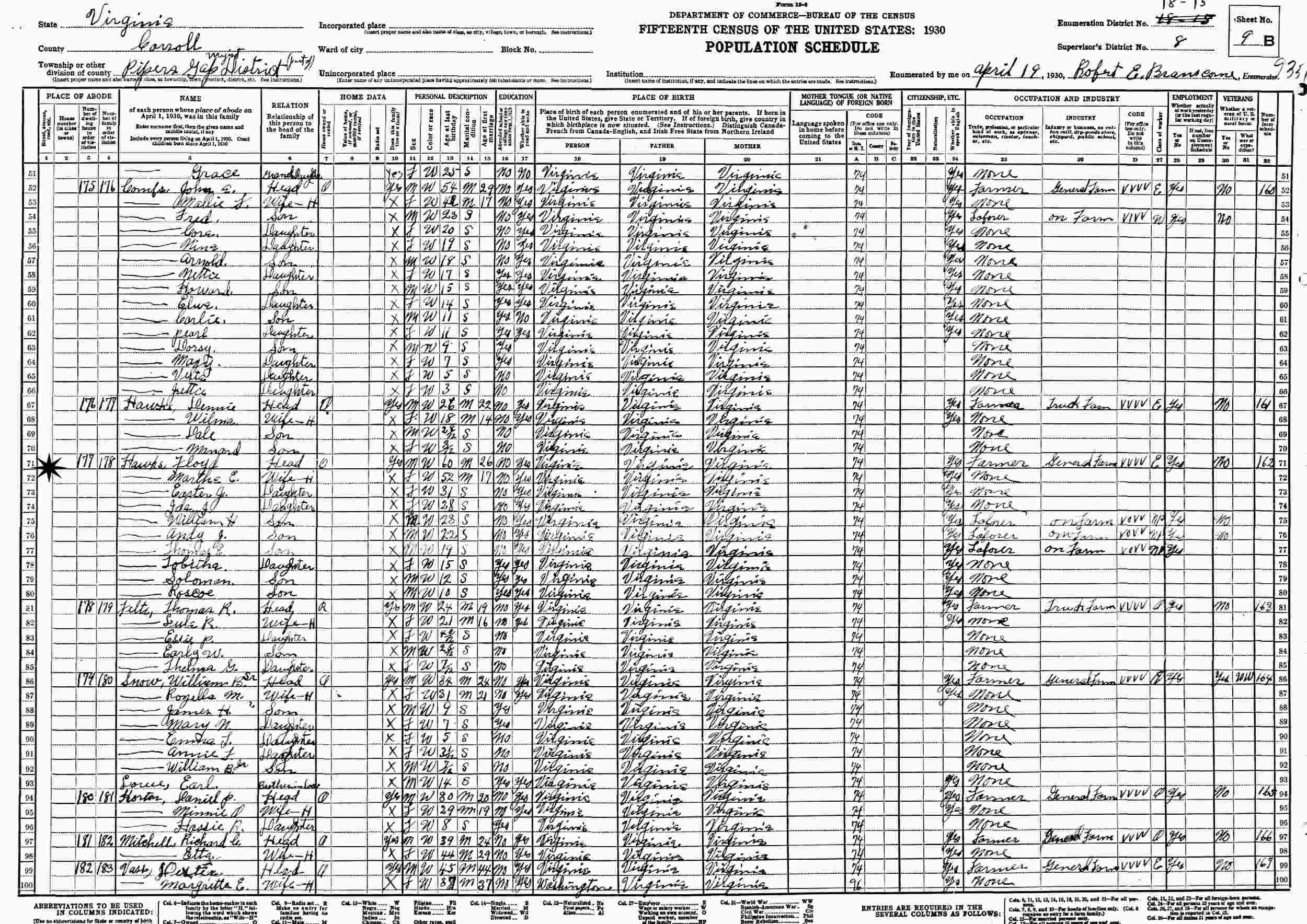 April 19, 1930 - Supervisor's District 8, Enumeration District 18-15, Pipers Gap Magisterial District, Carroll County, Virginia.
