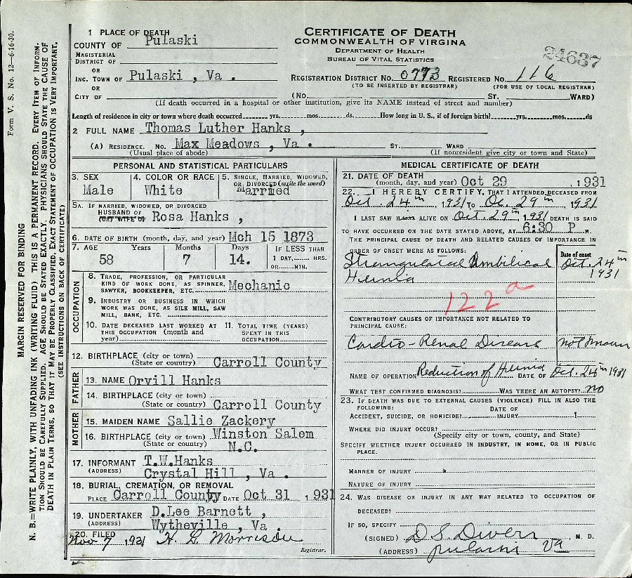 Died: October 29, 1931 in Pulaski, Pulaski County, Virginia.