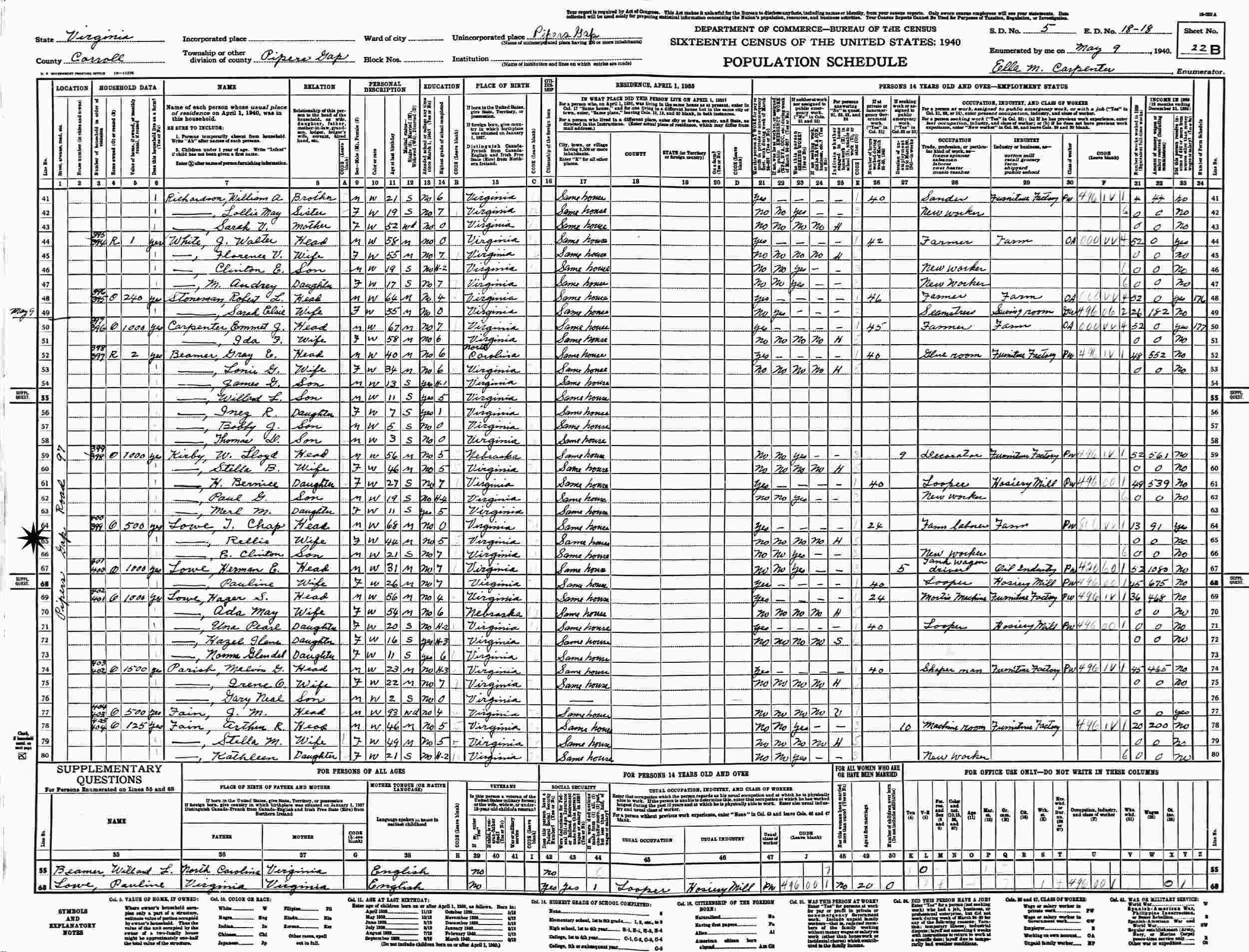 May 9, 1940 - Pipers Gap Road 97, Supervisor's District 5, Enumeration District 18-18, Pipers Gap, Carroll County, Virginia.