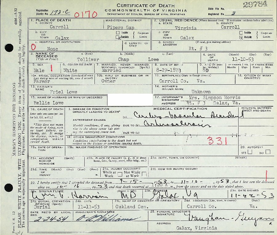 Died: November 10, 1953 in Galax, Carroll County, Virginia.