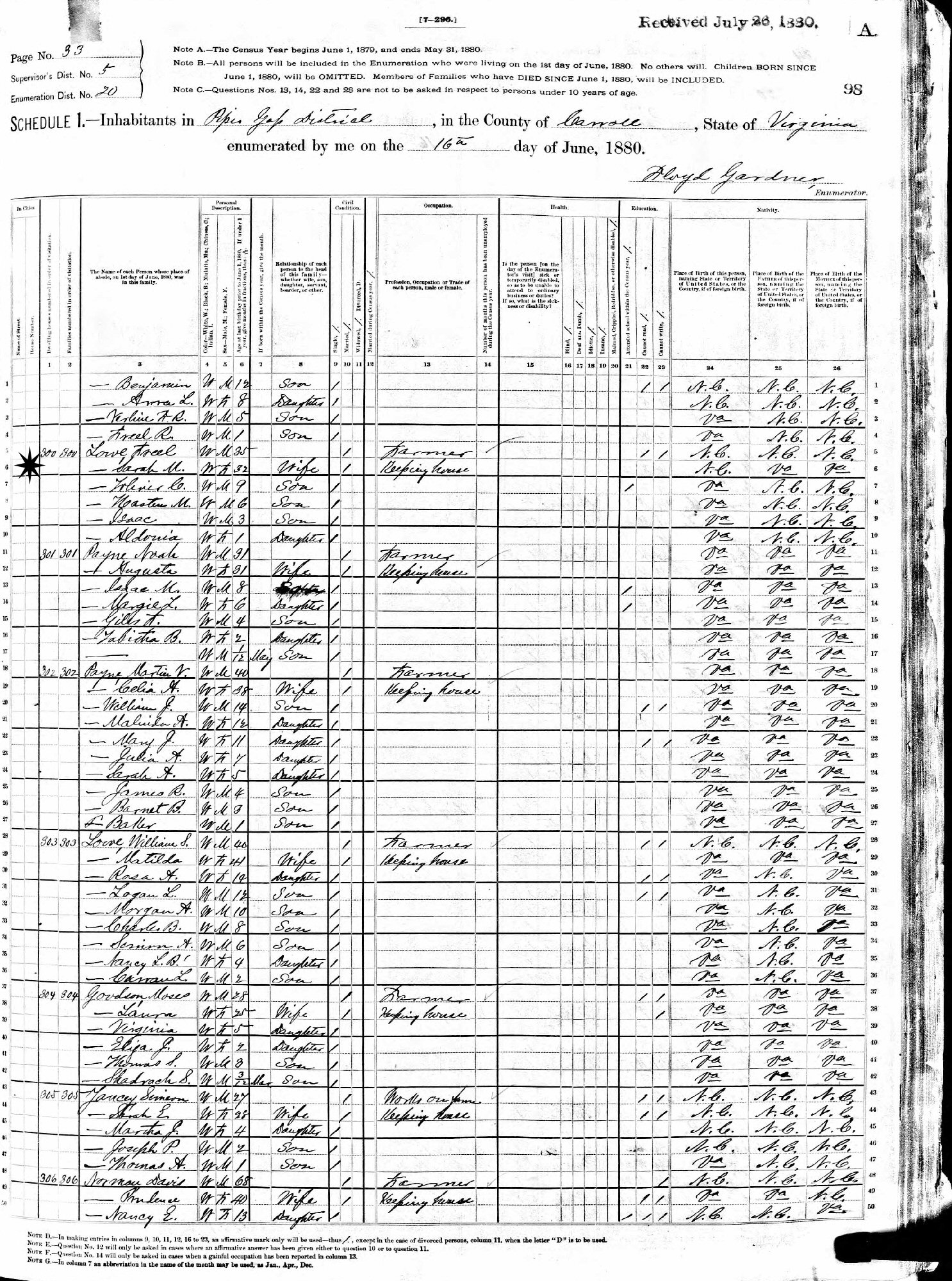 June 16, 1880 - Pipers Gap District, Supervisor's District 5, Enumeration District 20, Carroll County, Virginia.