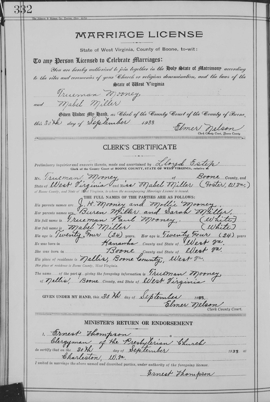 Married: Mabel Lessie Miller September 30, 1933 in Boone County, West Virginia.