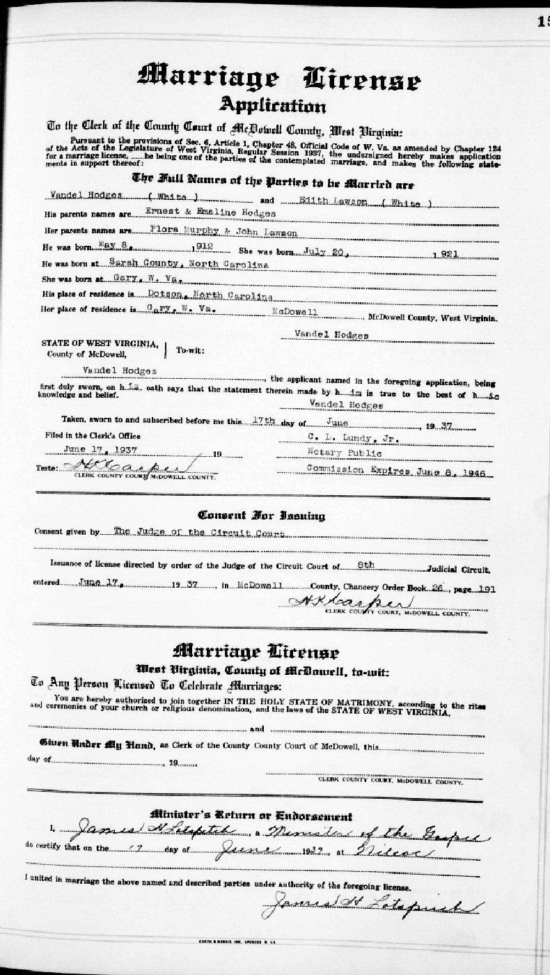 Married: Edith marie Lawson June 17, 1937 in McDowell County, West Virginia.