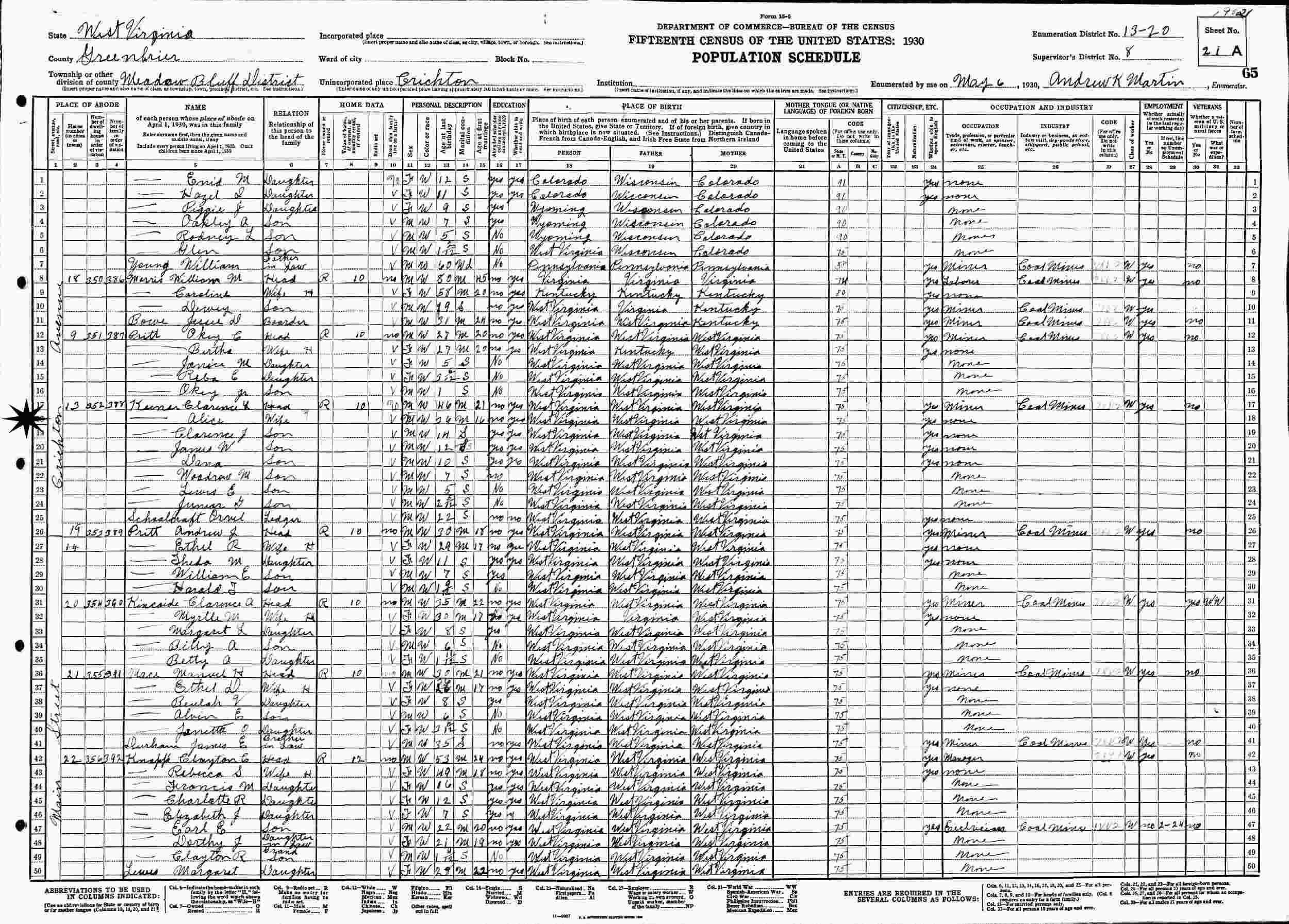 May 6, 1930 - Supervisor's District 8, Enumeration District 13-20, 13 Crichton Avenue, Meadow Bluff District, Greenbrier County, West Virginia.