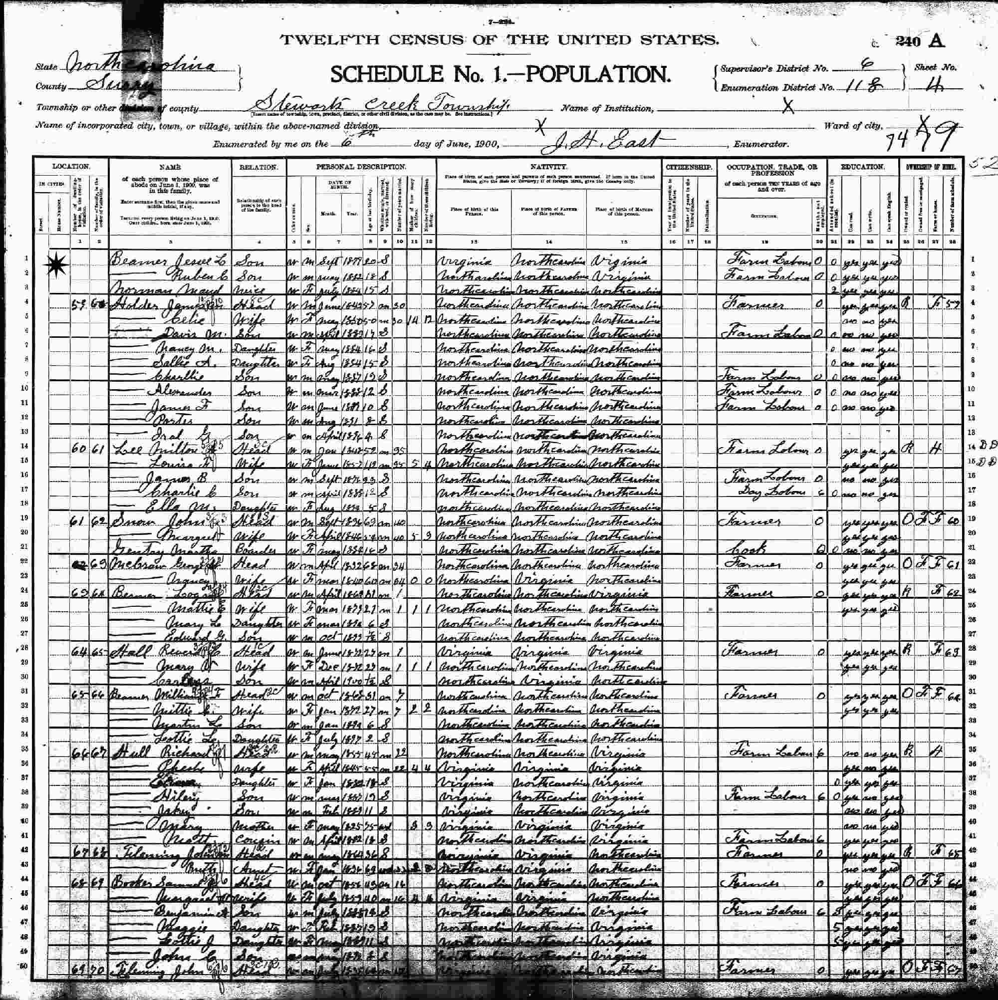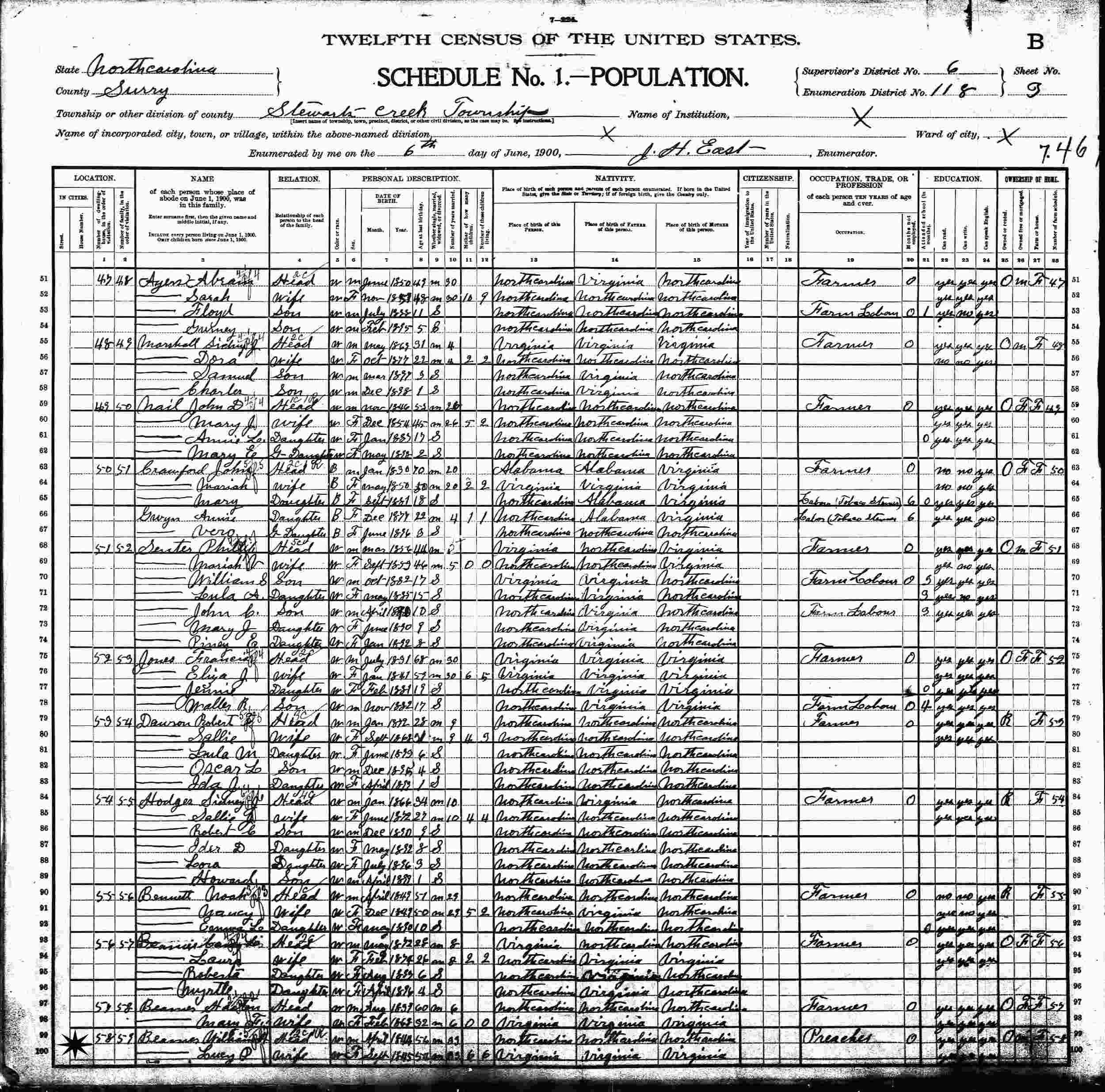 June 6, 1900 - Stewarts Creek, Supervisor's District 6, Enumeration District 118, Surry County, North Carolina (w/Uncle and Aunt, William and Lucy Beamer).