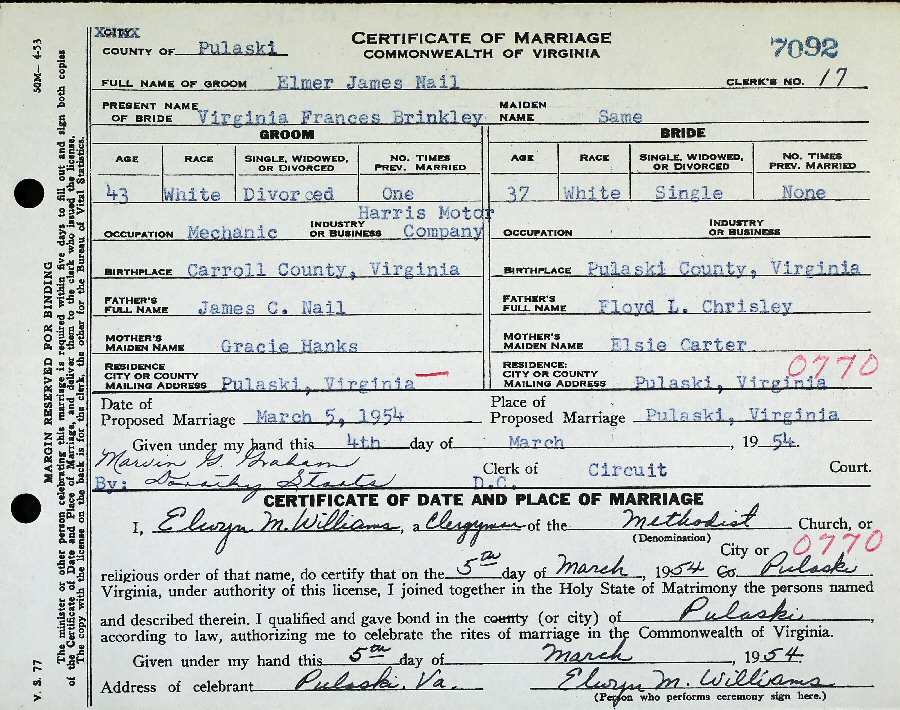 Married: Elmer James Nail March 5, 1954 in Pulaski County, Virginia.