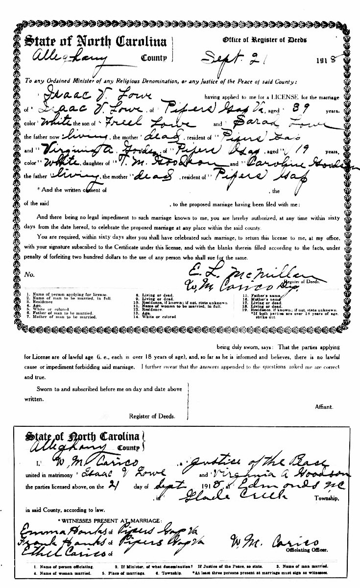 Married: (1) Isaac V Lowe Spetmber 21, 1918 in Glade Creek, Edmonds, Alleghany County, North Carolina. (b. July 27, 1876, Grayson County, Virginia; d. February 4, 1945, Carroll County, Virginia; Buried: Oakland United Methodist Church Cemetery, Carroll County, Virginia. Children: Whitt Wallace Lowe b. November 25, 1919, Carroll County, Virginia; d. April 21, 2000, Unknown. Gordon K Lowe b. Unknown. d. Unknown.)