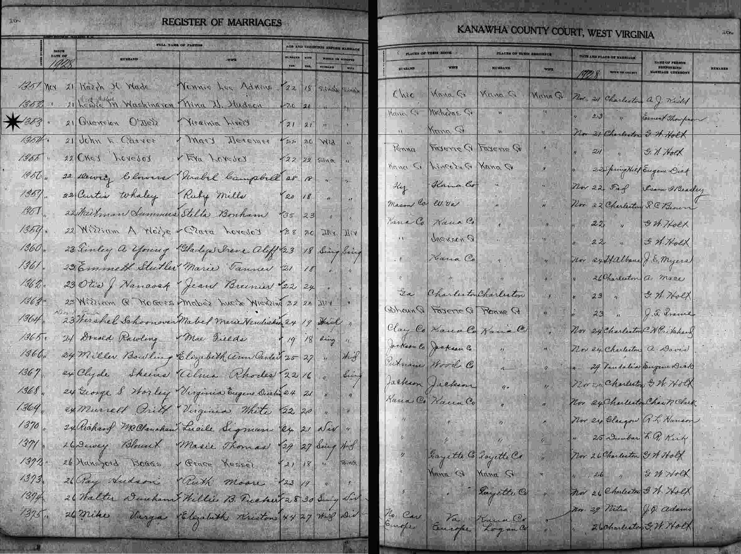 Married: (1) Quention O'Dell November 23, 1928 in Kanawha County, West Virginia. (Marriage license issued November 21, 1928. Divorce: Before April 3, 1940.)