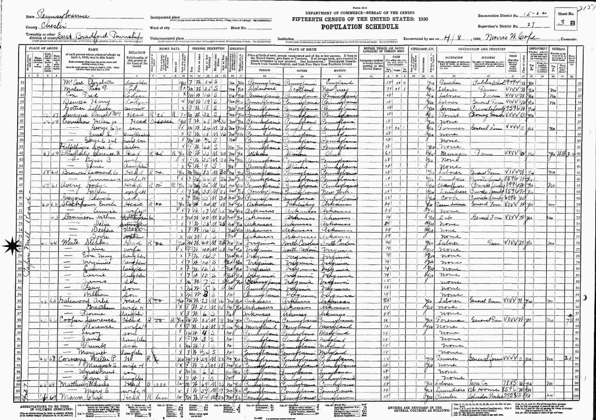 April 8, 1930 - Paper Mill Road, Supervisor's District 27, Enumeration District 15-22, East Bradford Township, Chester County, Pennslvania.