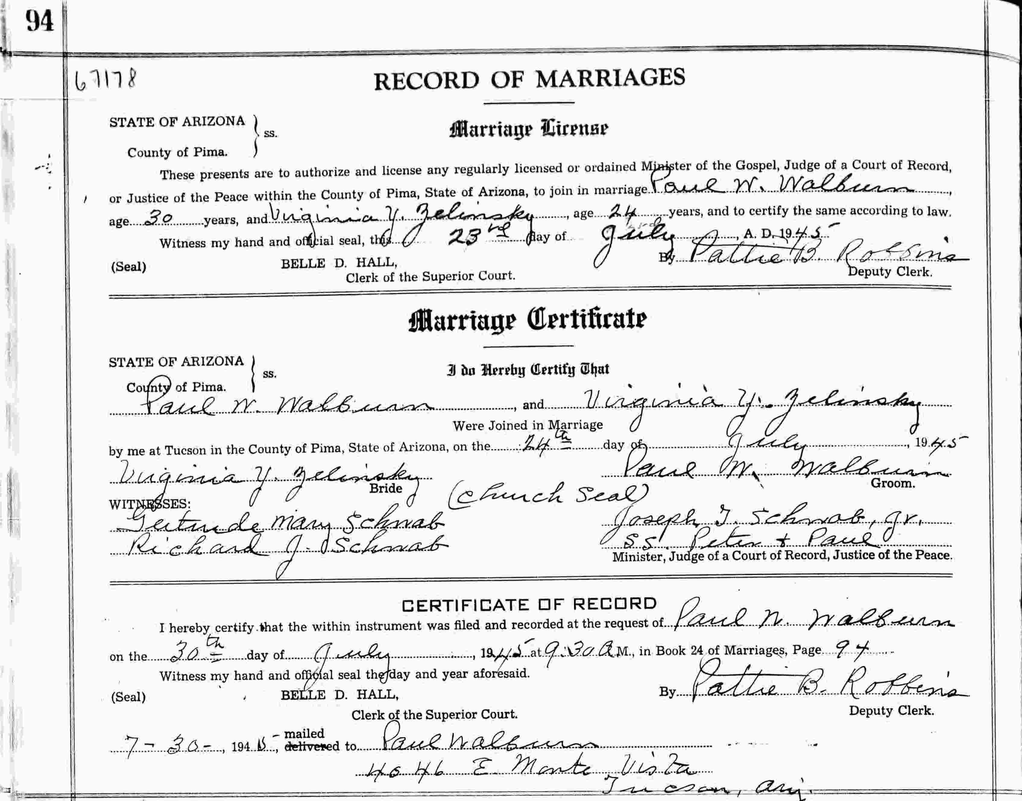 Married: Paul Wesley Walburn July 24, 1945 in Pima County, Arizona.