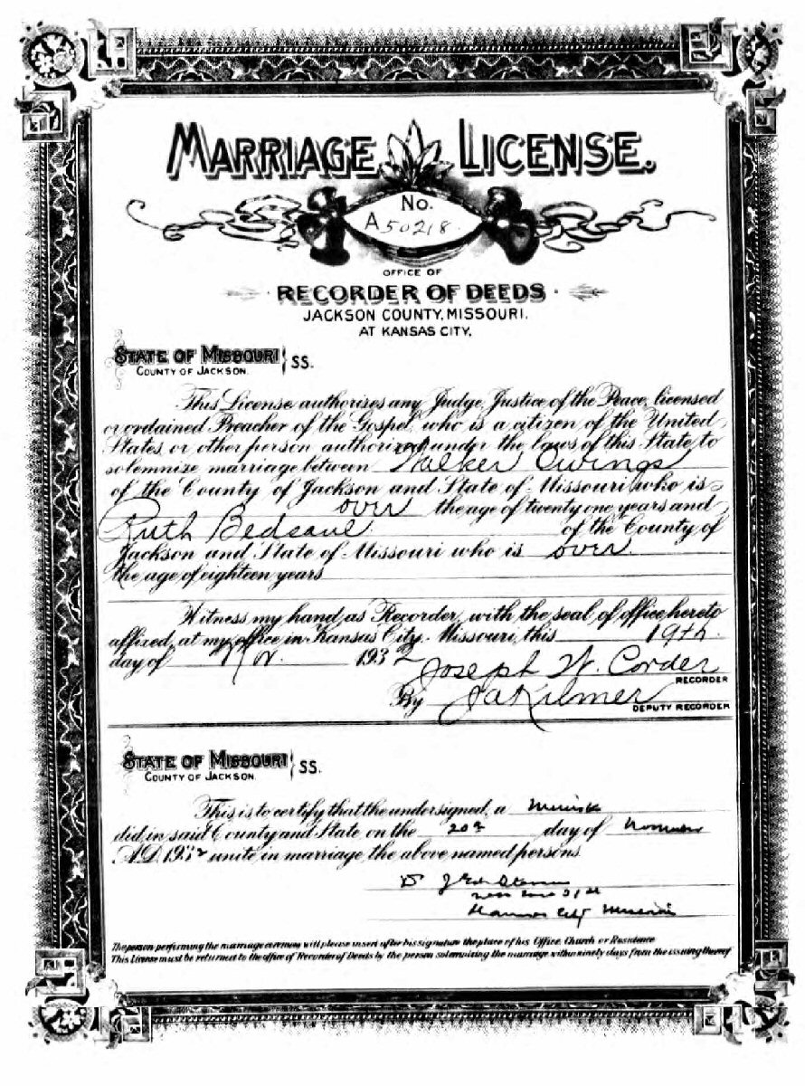 Married: Ruth Aline Bedsaul November 29, 1932 in Kansas City, Jackson County, Missouri.