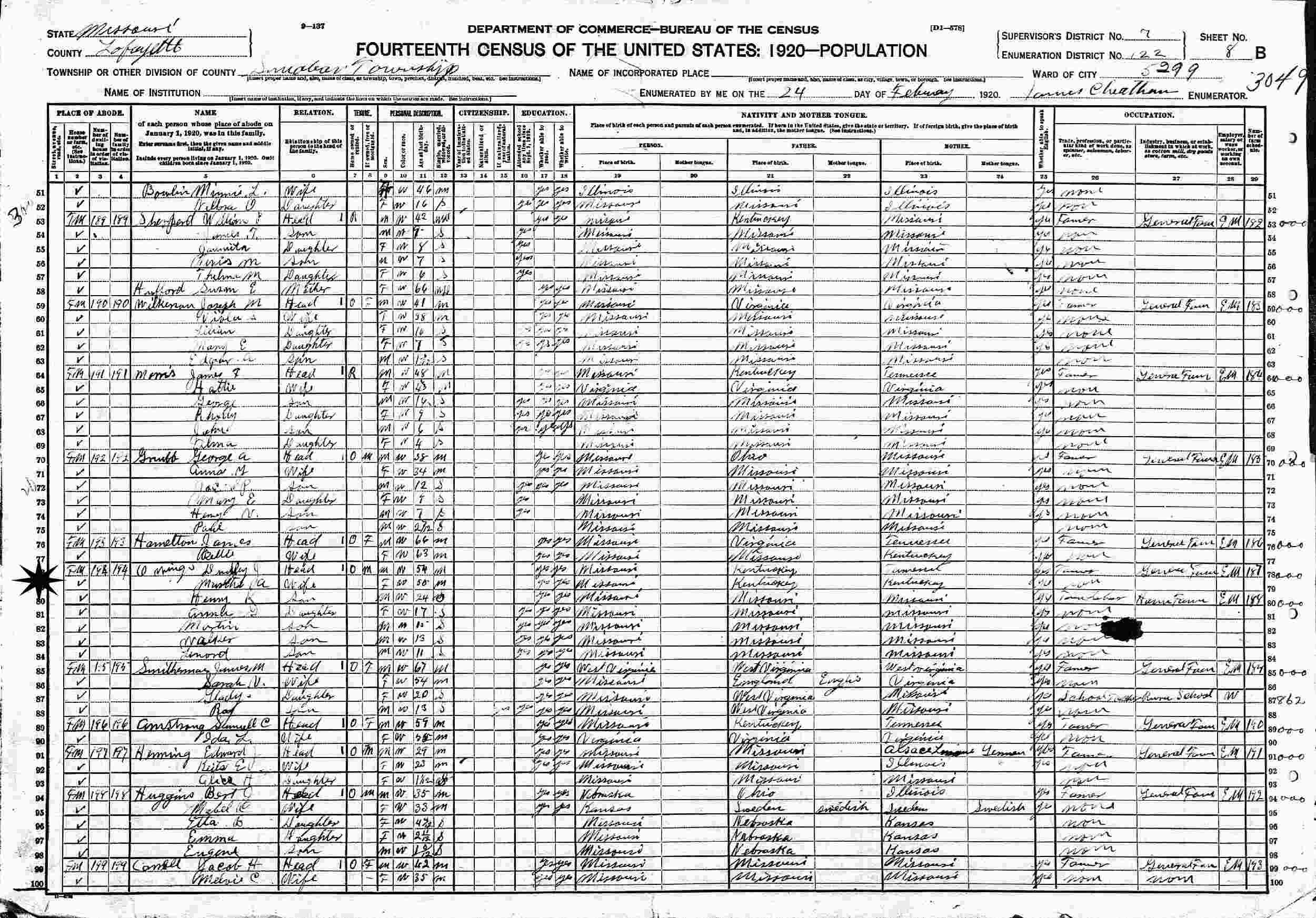 February 24, 1920 - Sniabar Township, Ward 5, Supervisor's District 7, Enumeration District 122, Lafayette County, Missouri.