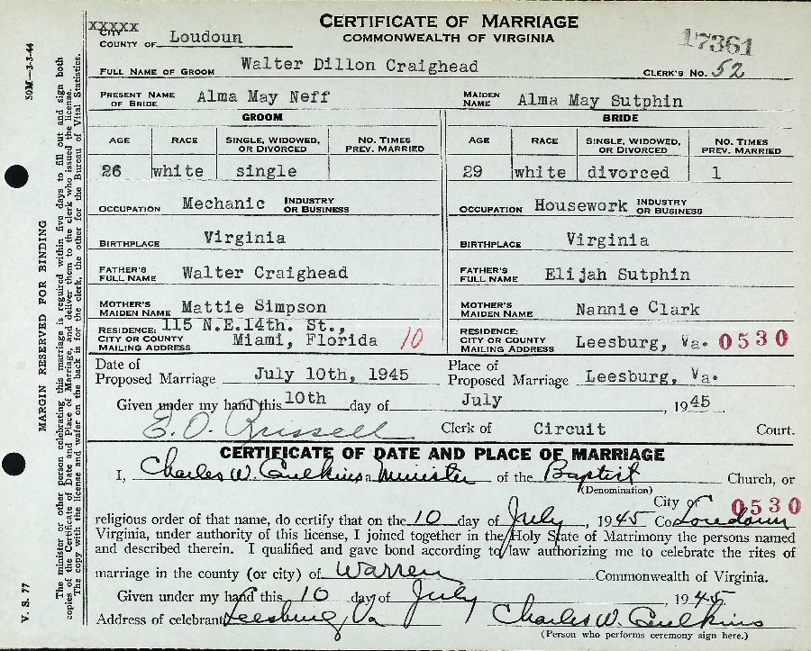 Married: Alma May (nee Sutphin) Neff July 10, 1945 in Leesburg, Loudoun County, Virginia.
