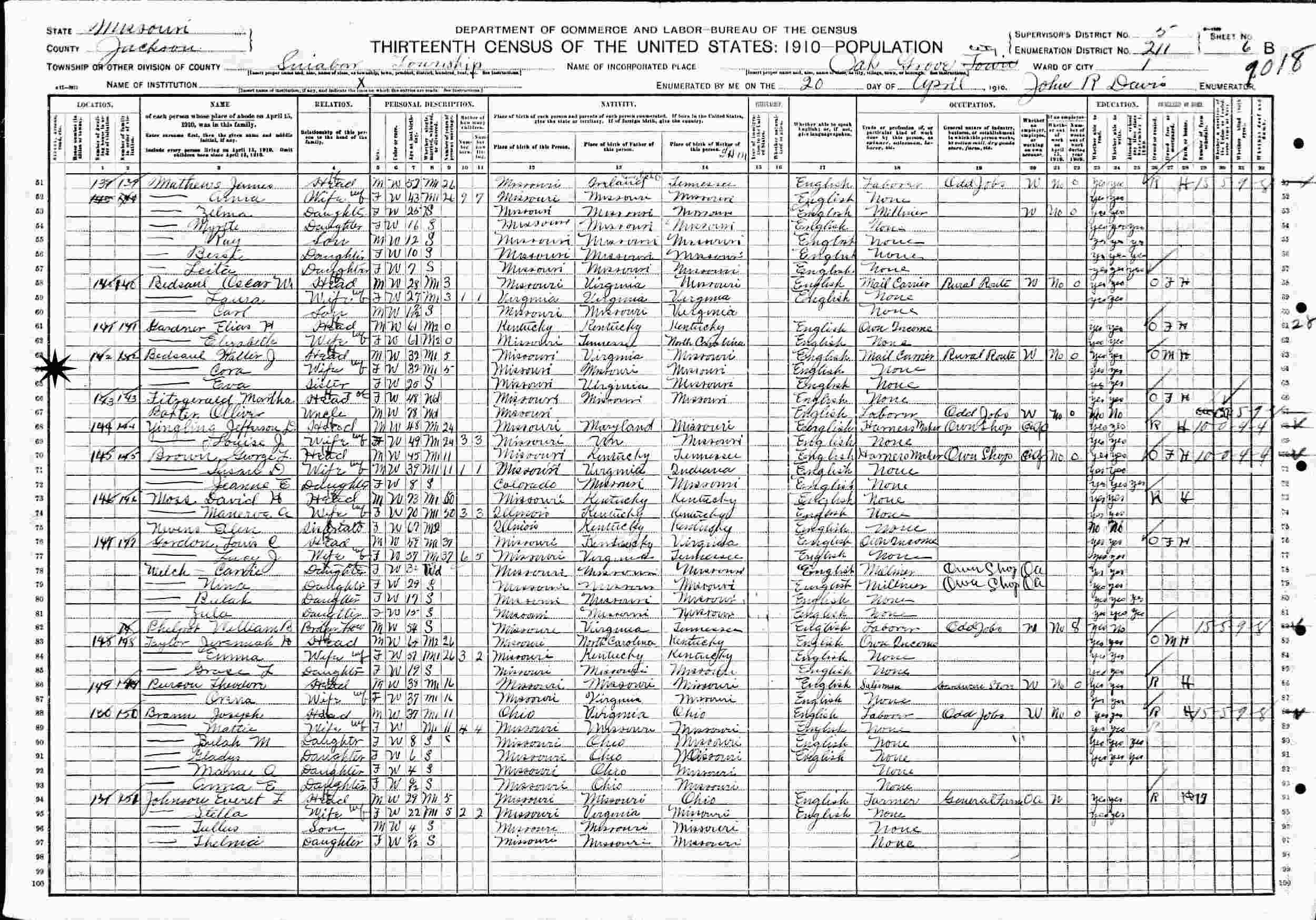 APril 20, 1910 - Ward 1, Supervisor's District 5, Enumeration District 211, Sniabar Township, Oak Grove City, Jackson County, Missouri.