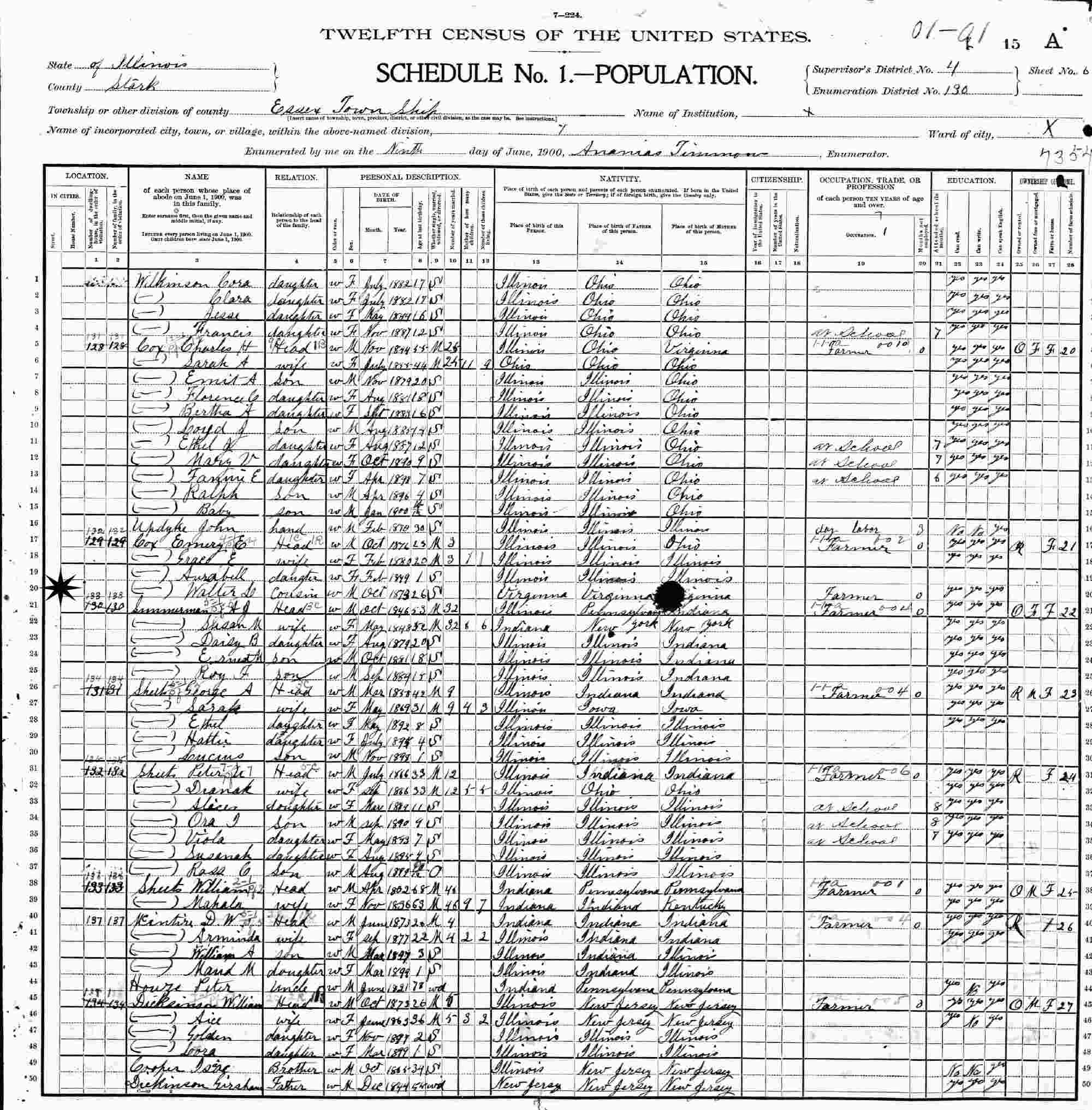 June 9, 1900 - Essex Township, Supervisor's District 4, Enumeration District 130, Stark County, Illinois W/cousin Emery E Cox.