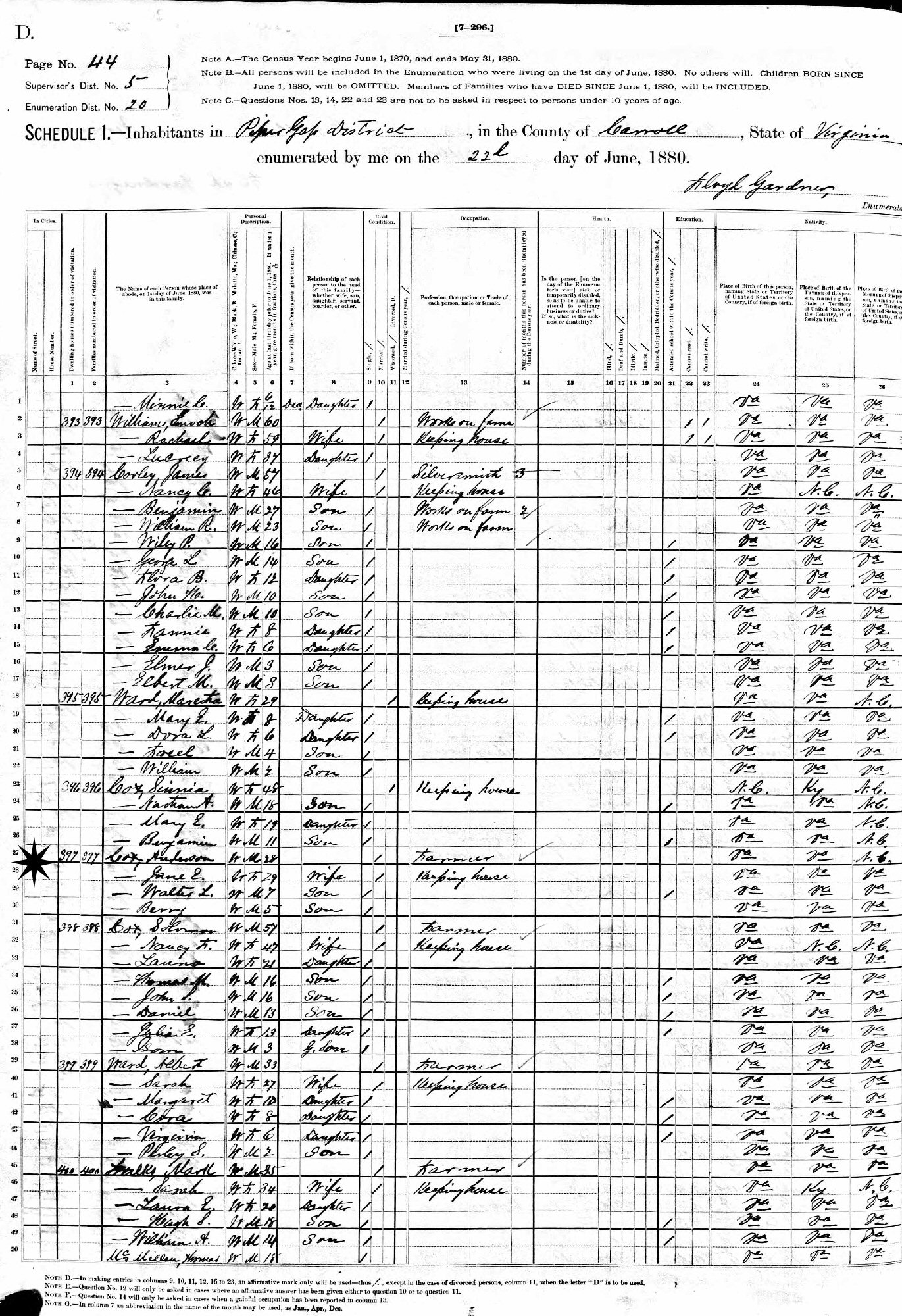 June 22, 1880 - Pipers Gap District, Supervisor's District 5, Enumeration District 20, Carroll County, Virginia.