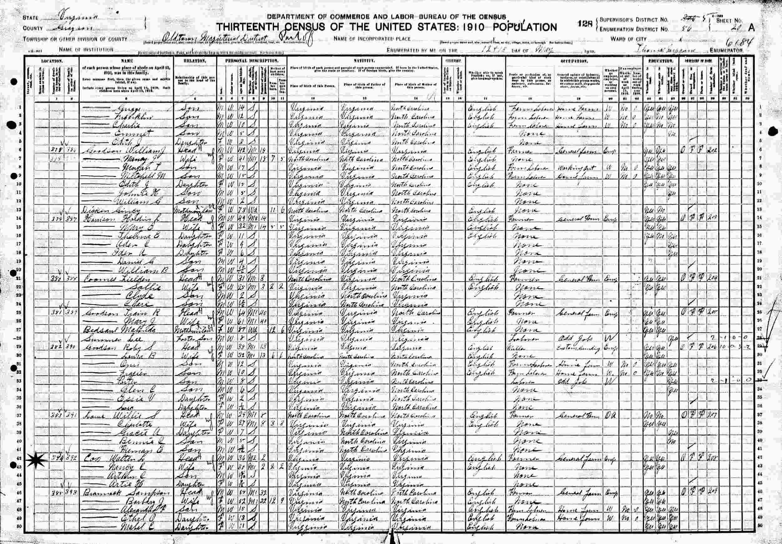 May 12-13, 1910 - Supervisor's District 5, Enumeration District 56, Oldtown Magisterial District, Grayson County, Virginia.