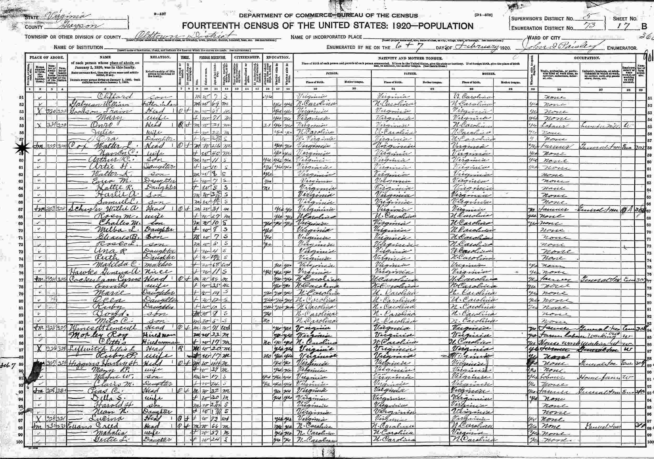 January 6, 1920 - Supervisor's District 5, Enumeration District 73, Oldtown Magisterial District, Grayson County, Virginia.