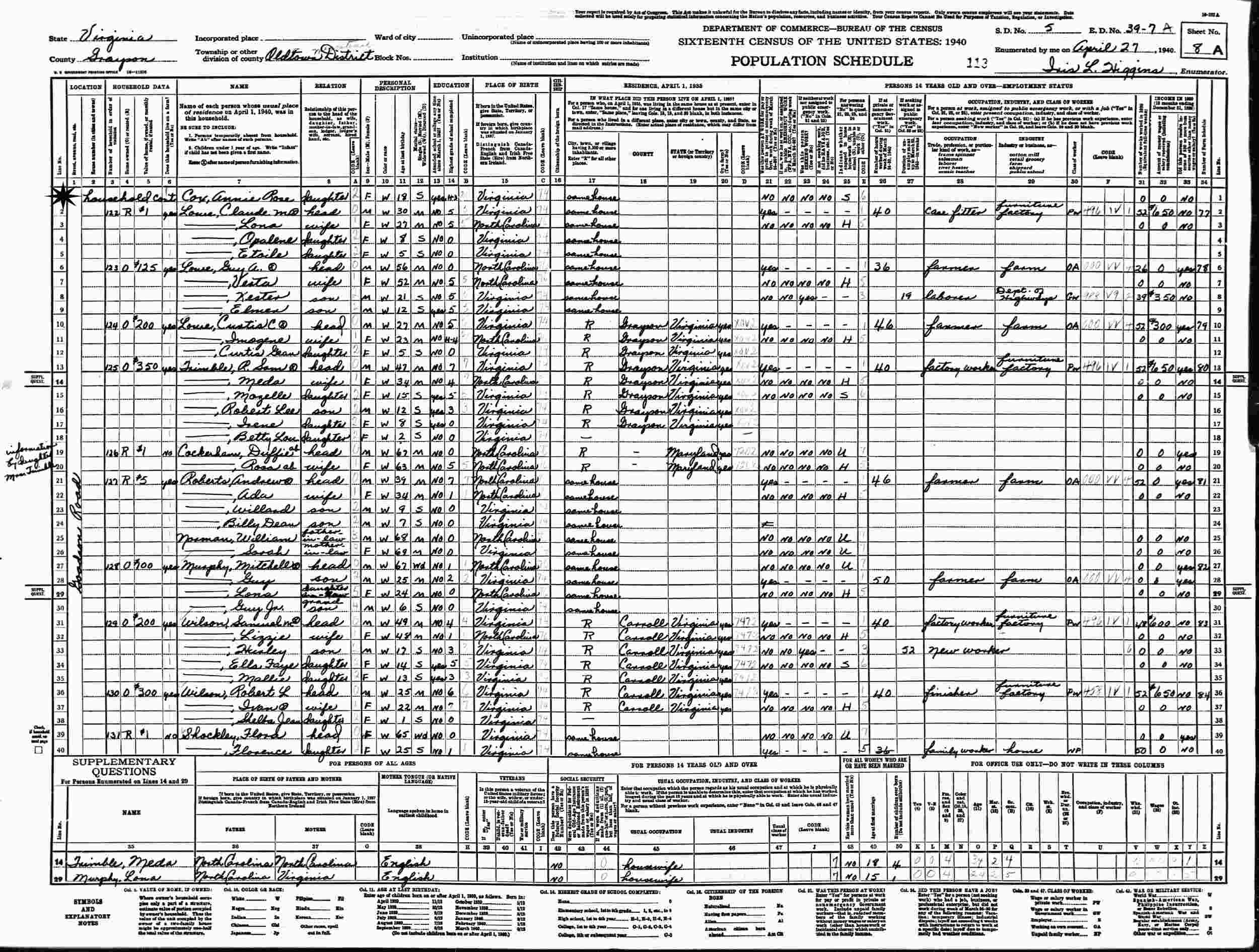 April 26, 1930 - Supervisor's District 8, Enumeration District 39-7, Oldtown Magisterial District, Grayson County, Virginia.