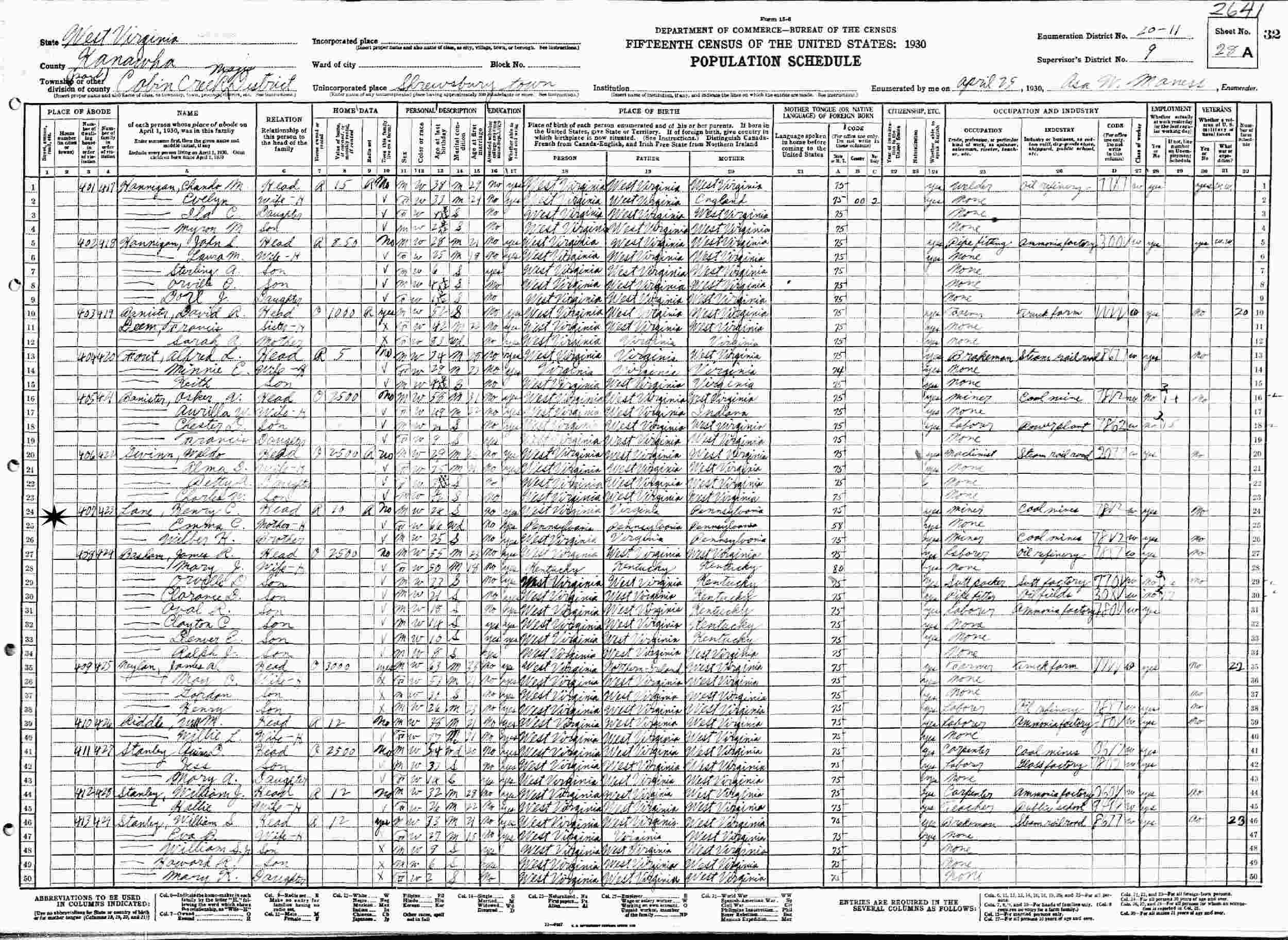 April 25, 1930 - Supervisor's District 9, Enumeration District 20-11, Cabin Creek Magisterial District, Shrewsbury, Kanawha Count, West Virginia.