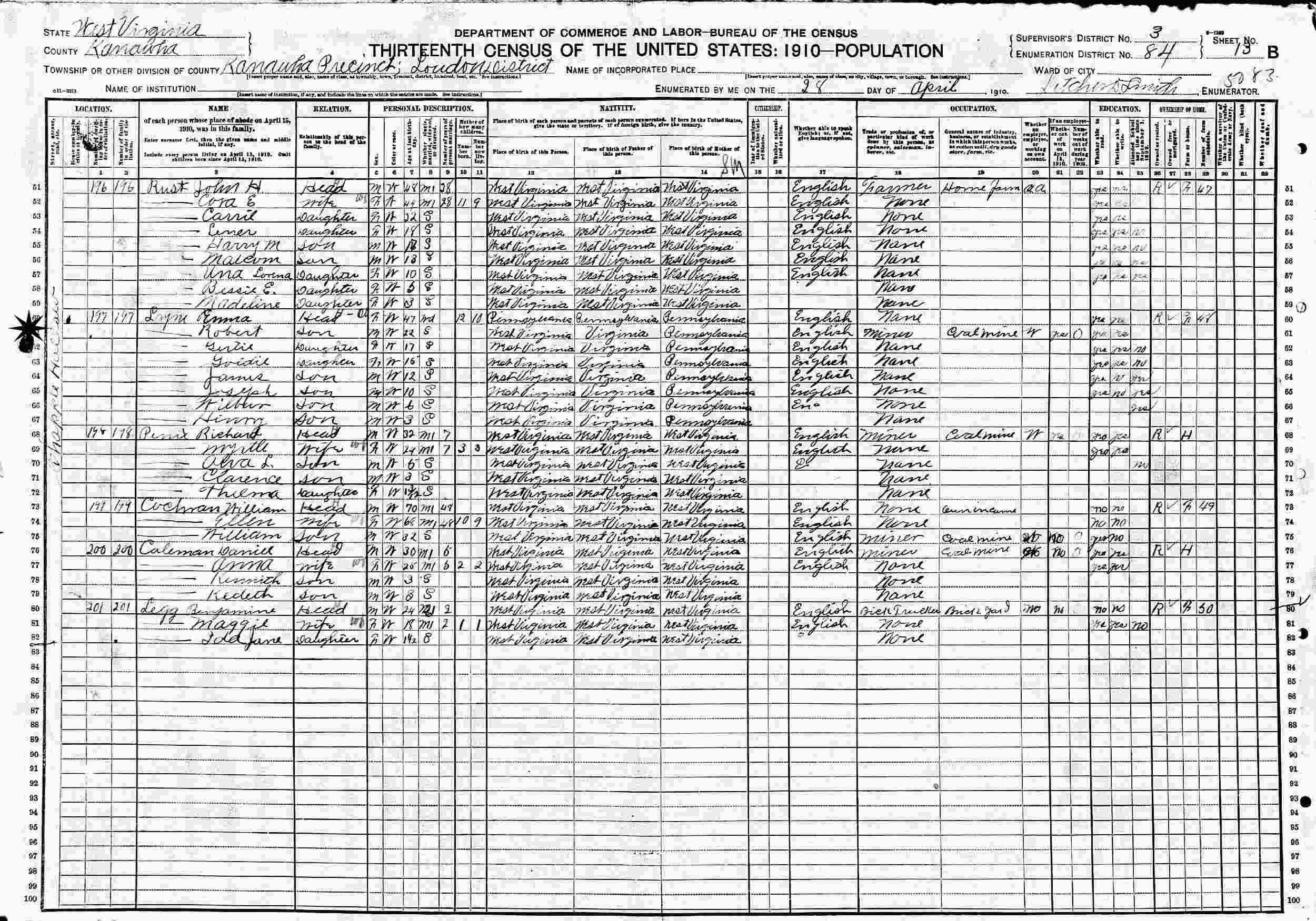 April 28, 1910 - Chapple Hollow, Supervisor's District 3, Enumeration District 84, London District, Kanawha County, West Virginia.