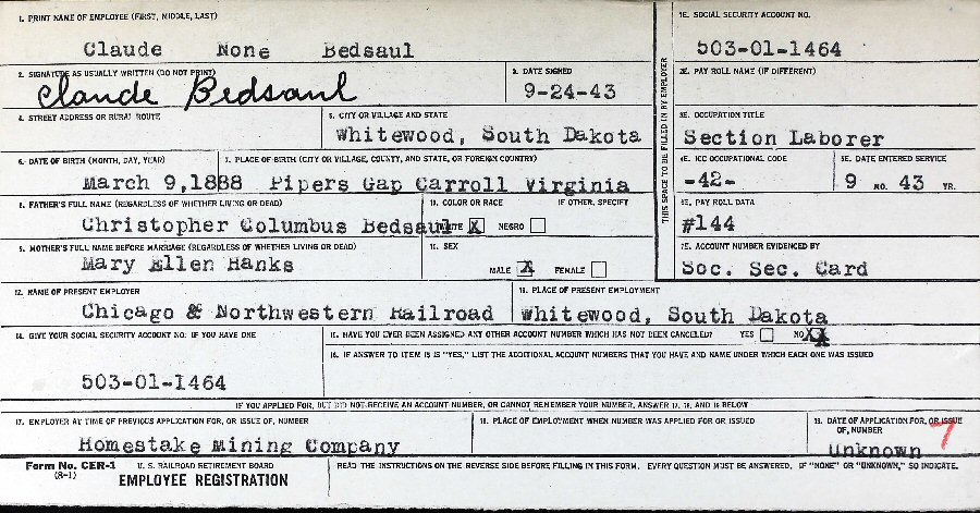 Notes for WILLIAM CLAUDE BEDSAUL:
