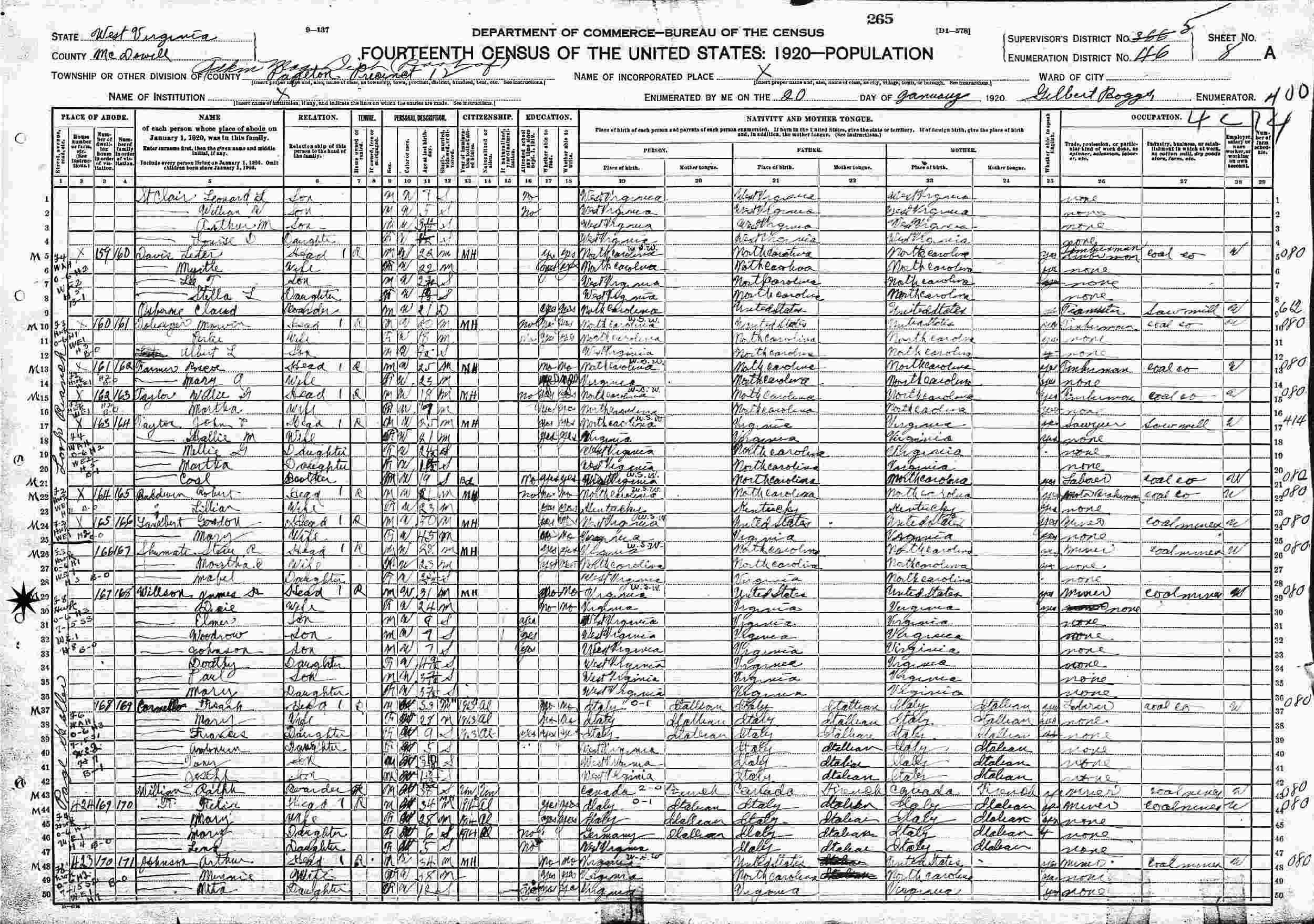 January 20, 1920 - Page Heller Street, Supervisor's District 266, Enumeration District 46, Pageton Precinct 12, Adkin, McDowell County, West Virginia.