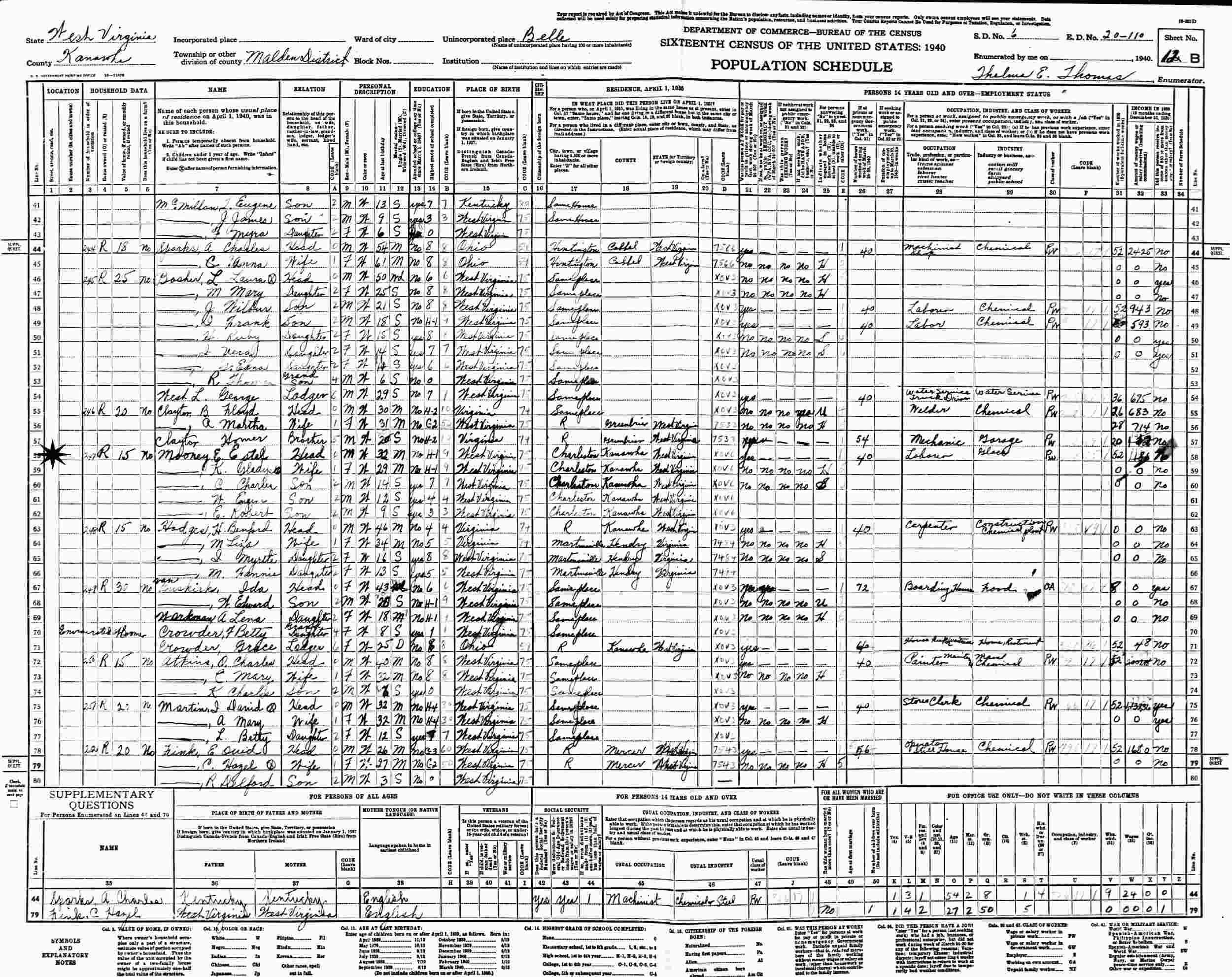 1940 - Supervisor's District 6, Enumeration District 20-110, Malden District, Belle, Kanawha County, West Virginia.